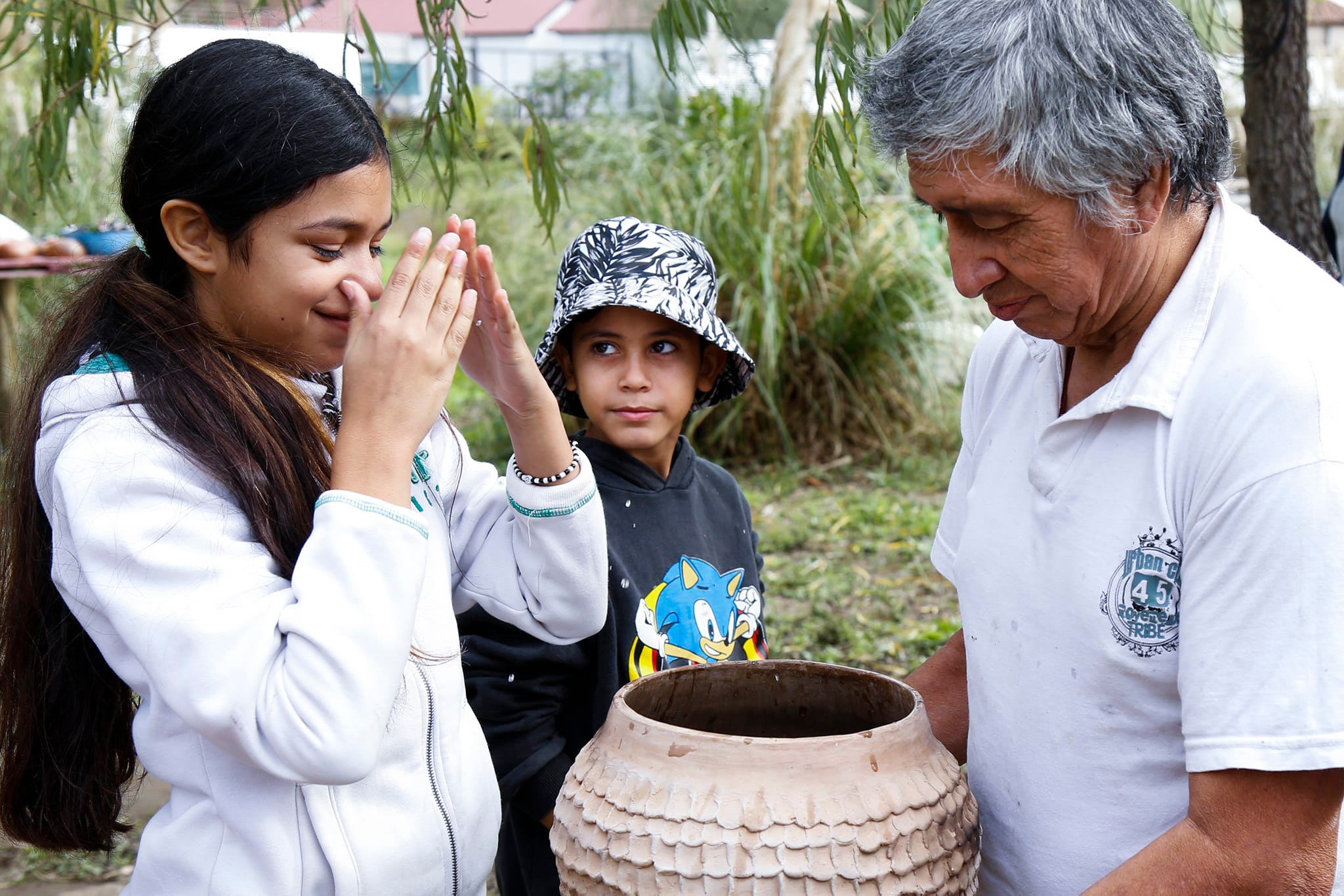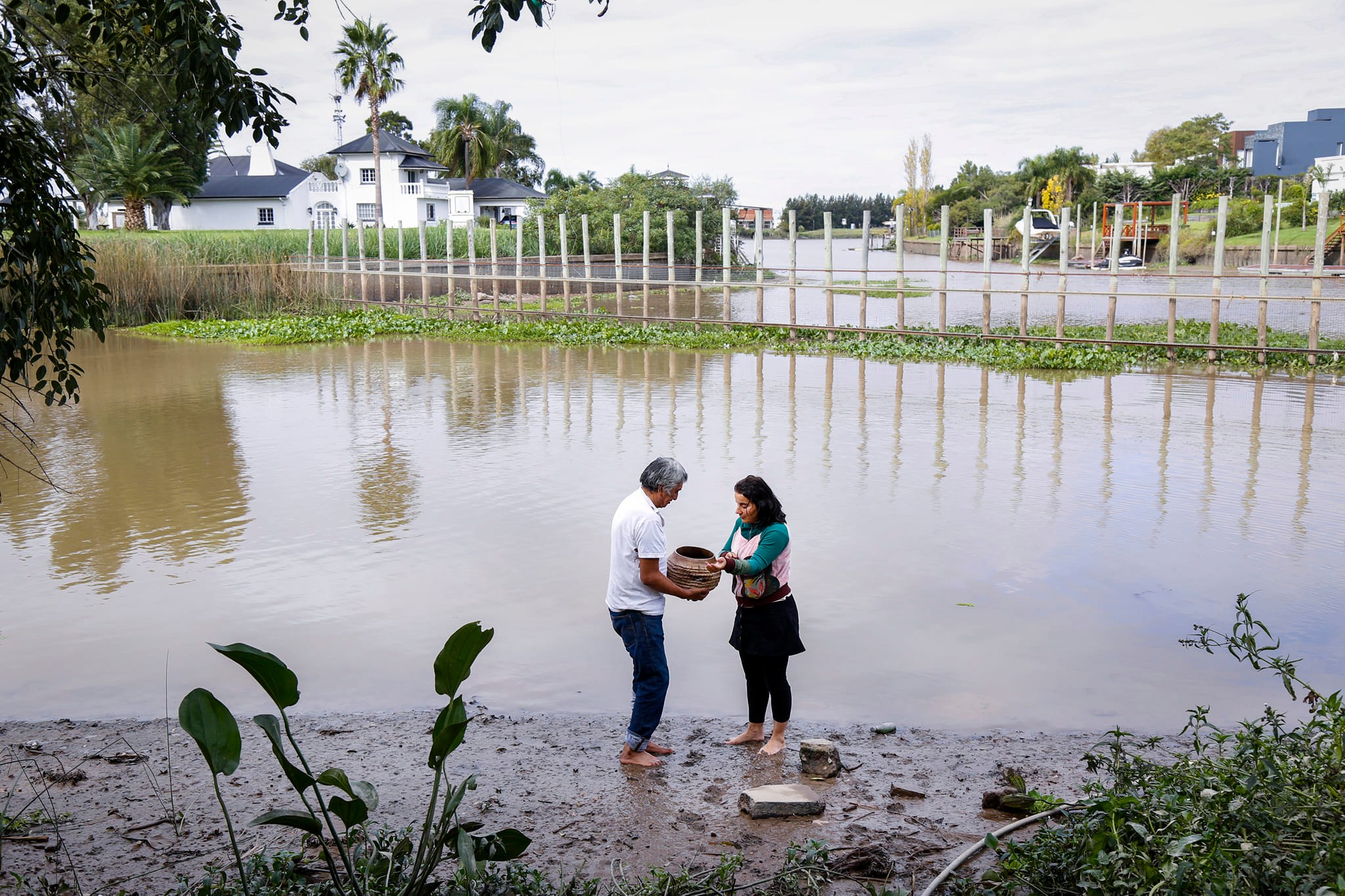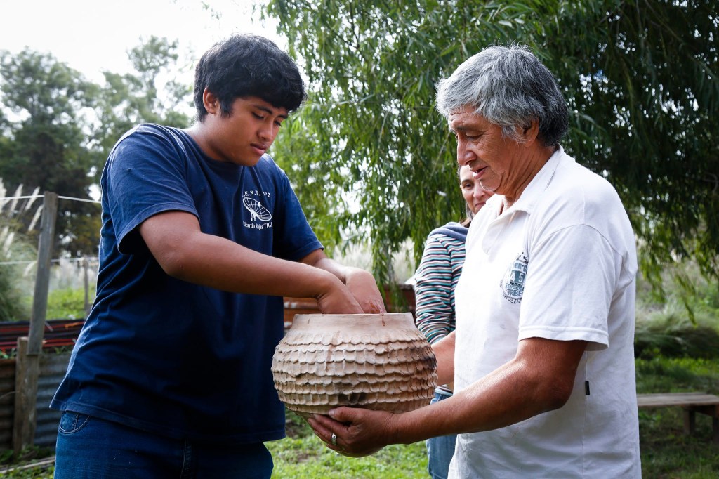 Antes de dar inicio al primer fuego, se realizó una ceremonia donde cada persona lavó sus manos en una olla de barro y para finalizar, esa agua fue volcada en el Canal Villanueva. Este ritual de purificación fue guiado por Santiago Chara, del Consejo de Ancianos de Punta Querandí y autoridad de la Comunidad Qom “Cacique Ramón Chara” de Benavídez, con el acompañamiento de la profesora de arte Marisol Martínez, ambos responsables de coordinar la construcción del horno de barro durante los últimos meses.