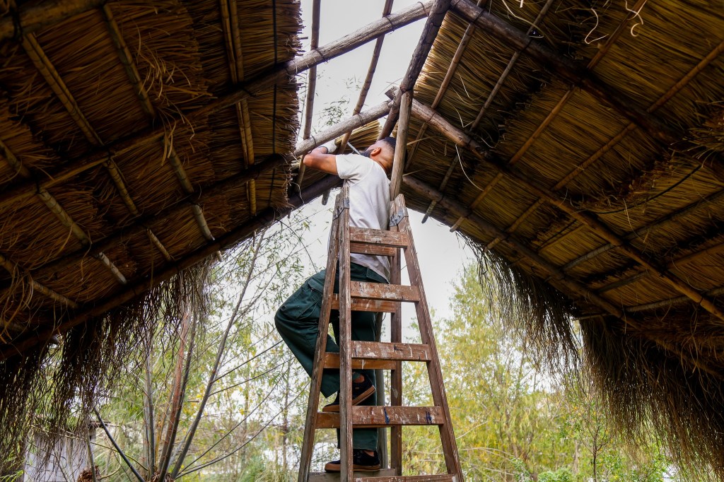 Entre otras tareas, se continuó el tejido del techo de paja brava del quincho comunitario, un proyecto que se encuentra muy cerca de su finalización y es una de las próximas prioridades. En la jornada de este 11 de junio, se cortarán más hojas de esta planta para seguir con esta obra en las siguientes semanas.