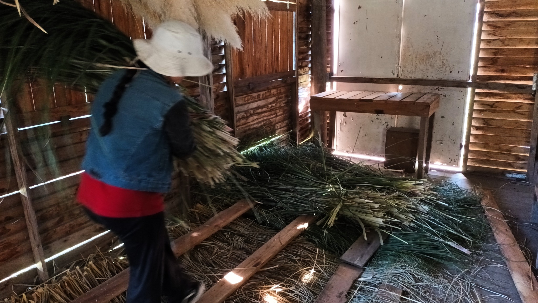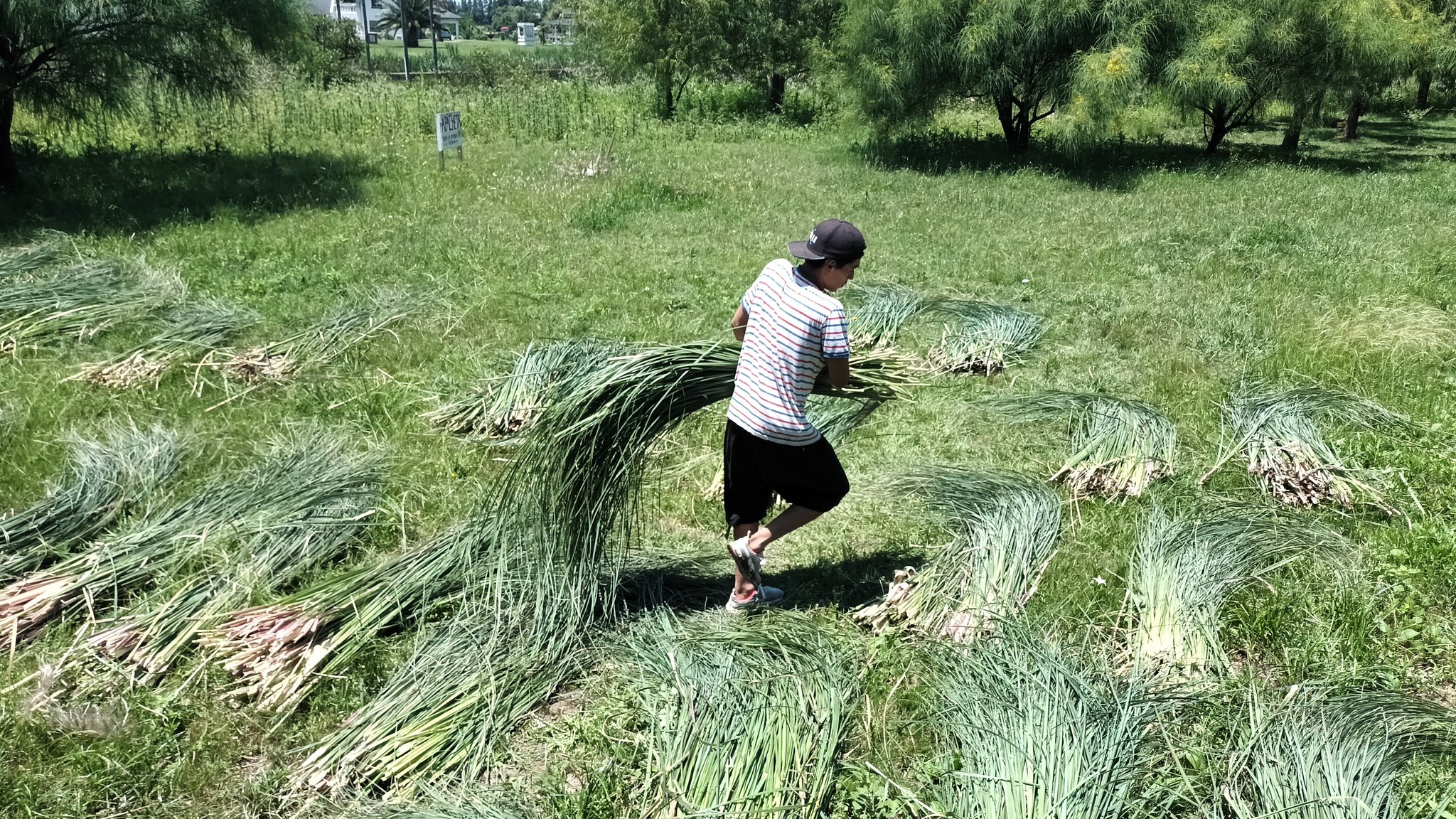 El domingo 10 de diciembre, con la luna en cuarto menguante, la actividad central fue el corte de paja brava para el último tramo de la cumbrera del quincho. Una construcción que hace meses ya cumple su función de dar sombra y protección ante fuertes calores o lluvias.