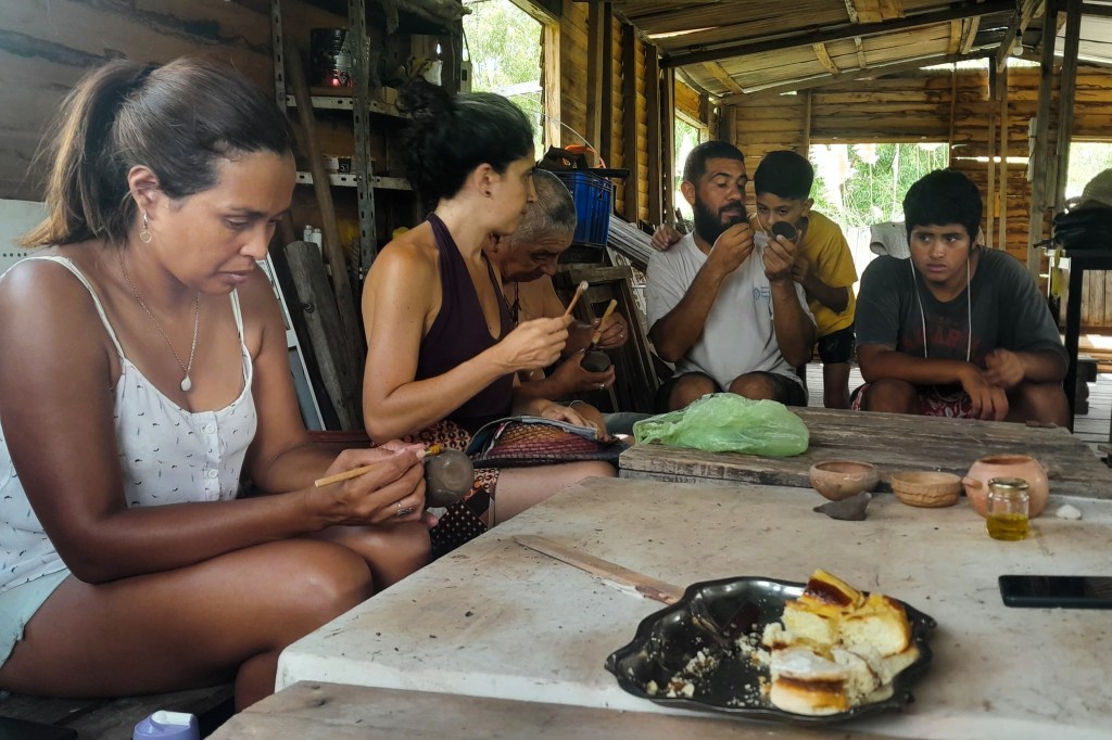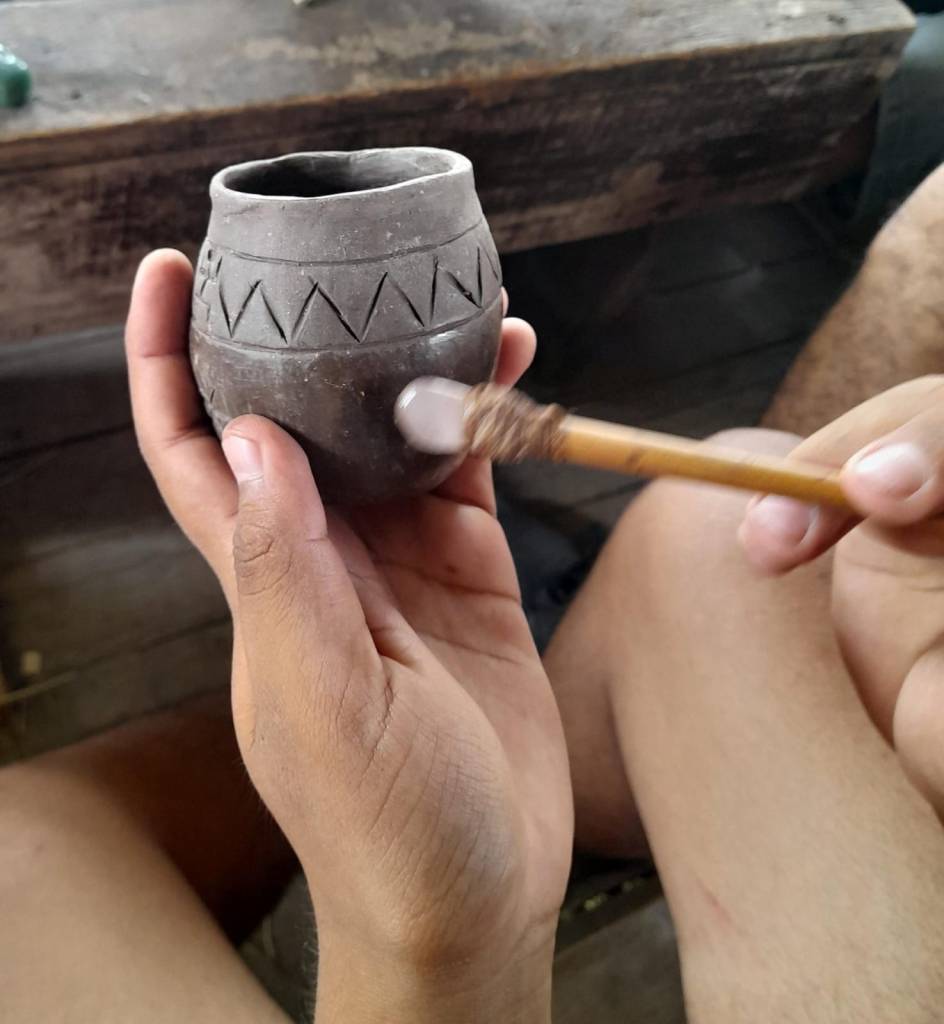 «Terminamos de bruñir los mates y los vasos que habíamos empezado el mes pasado. Y empezamos a abrir unos nuevos. Se planteó la necesidad de un sahumador para la comunidad, porque está roto el que tenían. Entonces el próximo proyecto va a ser un sahumador para las ceremonias. Y también para un futuro, hacer un recipiente para las ceremonias del agua», describió Julieta Medina del Taller Anatiri, quien guía este espacio de formación junto a Florencia Borowski del Taller Amaru, ambas vecinas de Escobar.