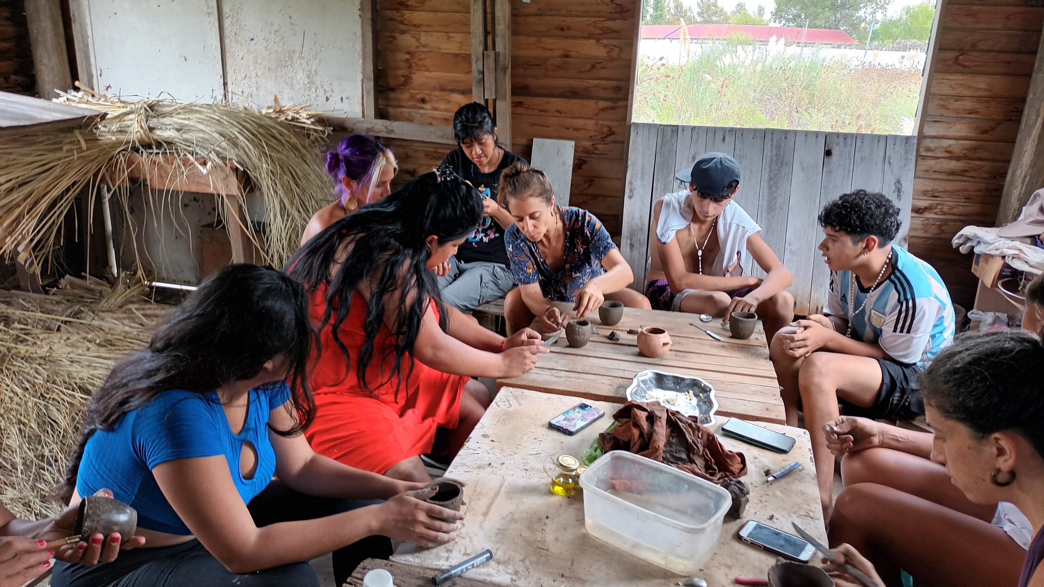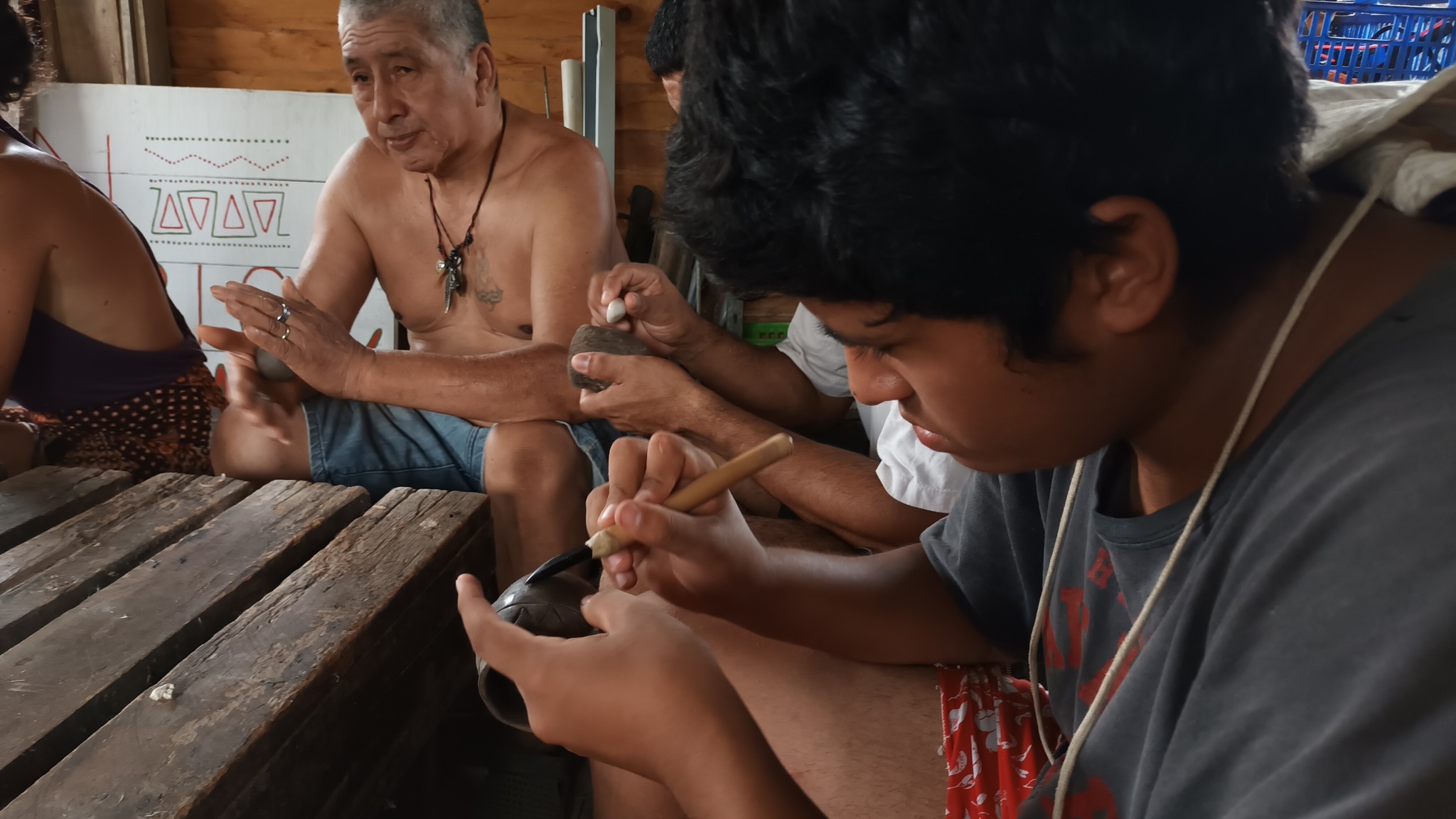 «Terminamos de bruñir los mates y los vasos que habíamos empezado el mes pasado. Y empezamos a abrir unos nuevos. Se planteó la necesidad de un sahumador para la comunidad, porque está roto el que tenían. Entonces el próximo proyecto va a ser un sahumador para las ceremonias. Y también para un futuro, hacer un recipiente para las ceremonias del agua», describió Julieta Medina del Taller Anatiri, quien guía este espacio de formación junto a Florencia Borowski del Taller Amaru, ambas vecinas de Escobar.