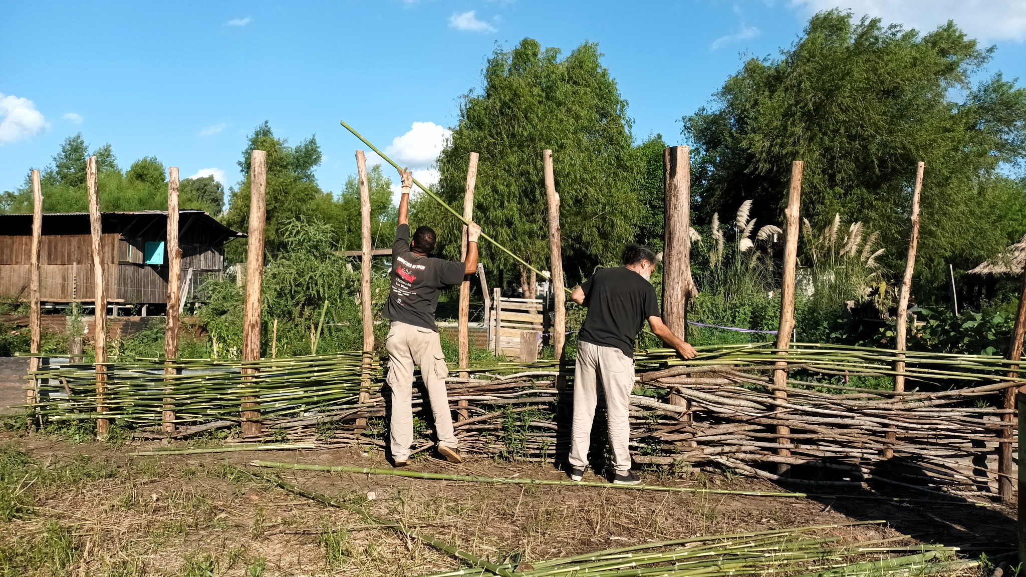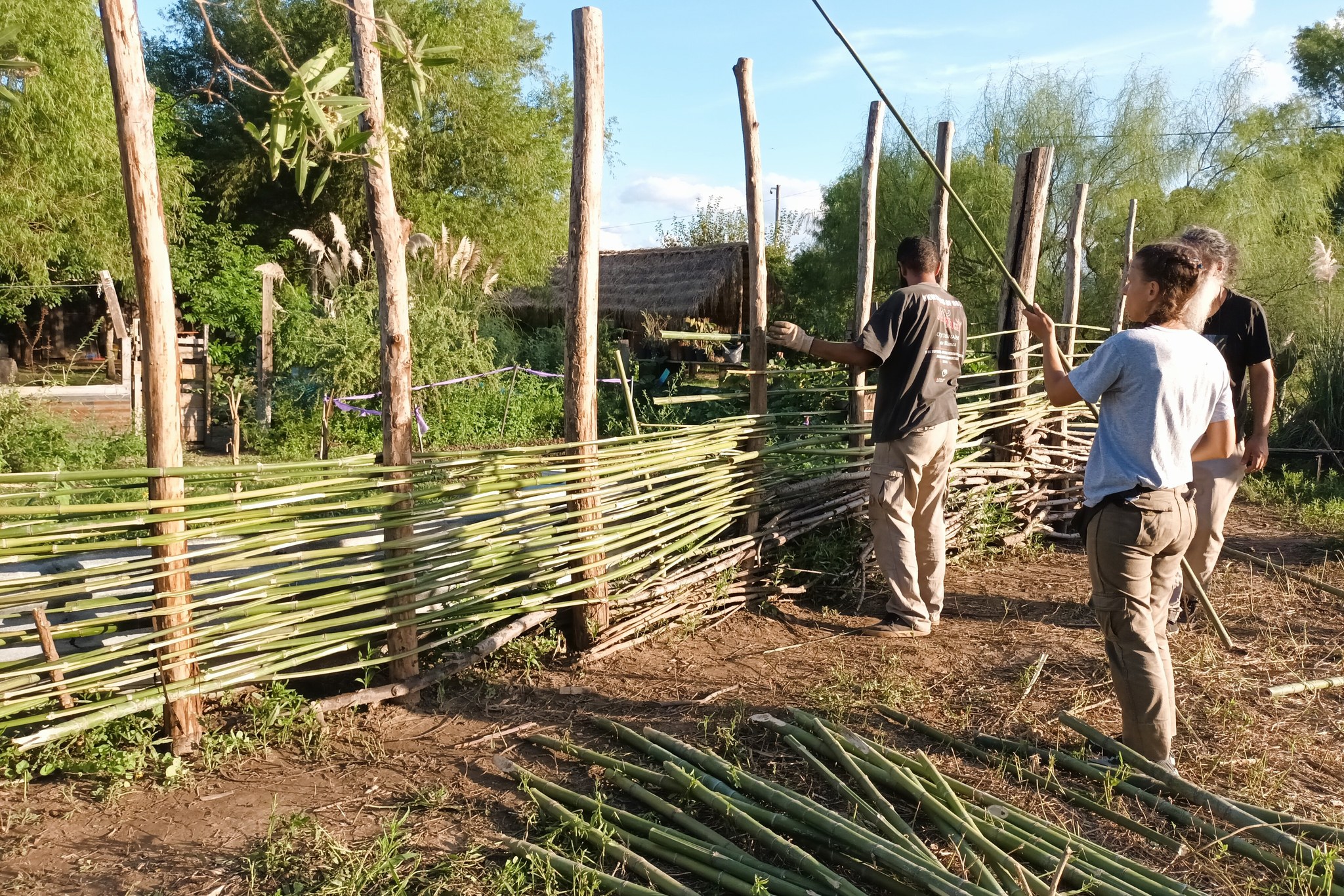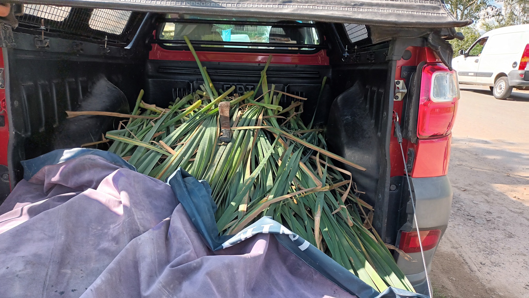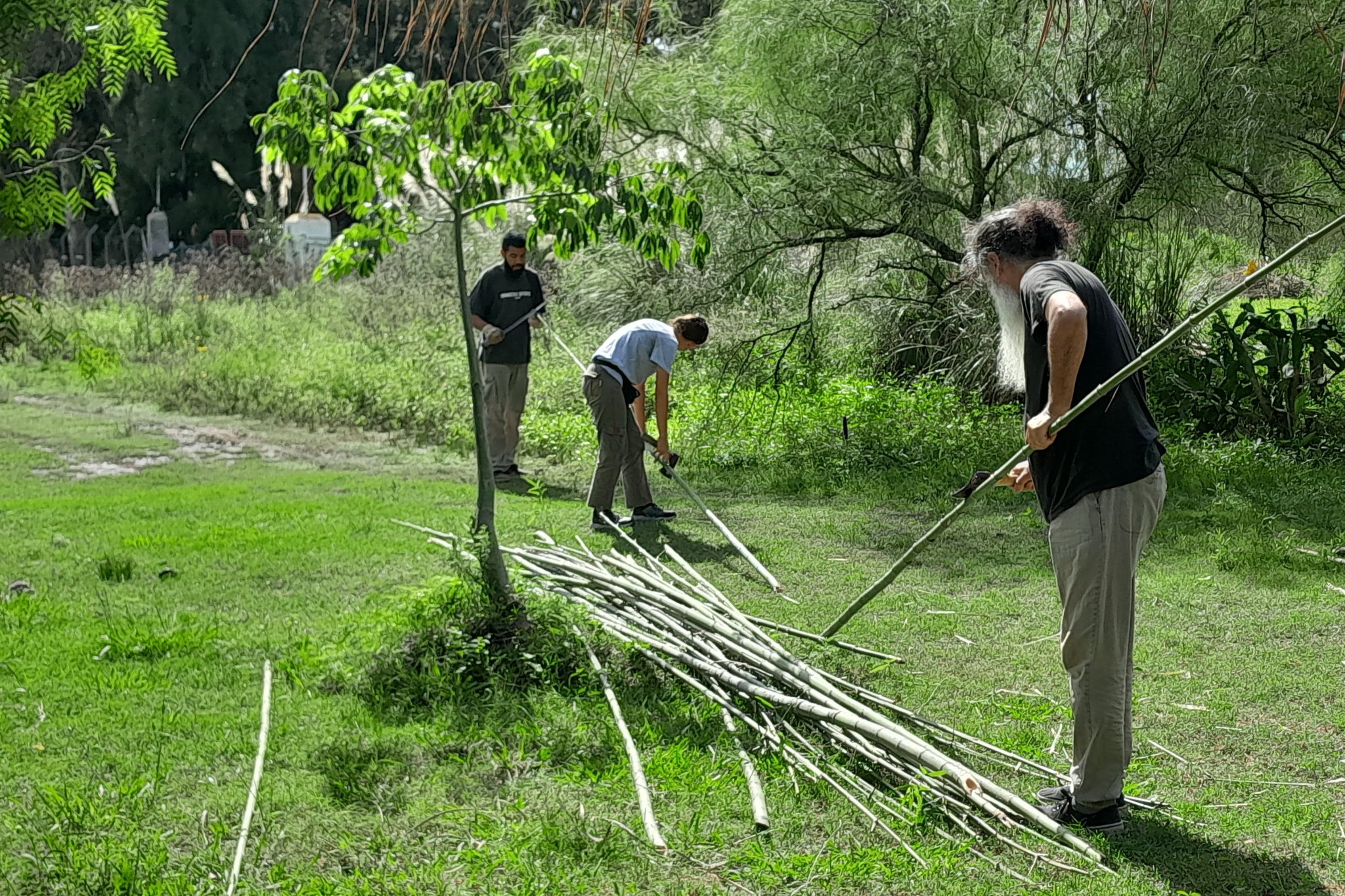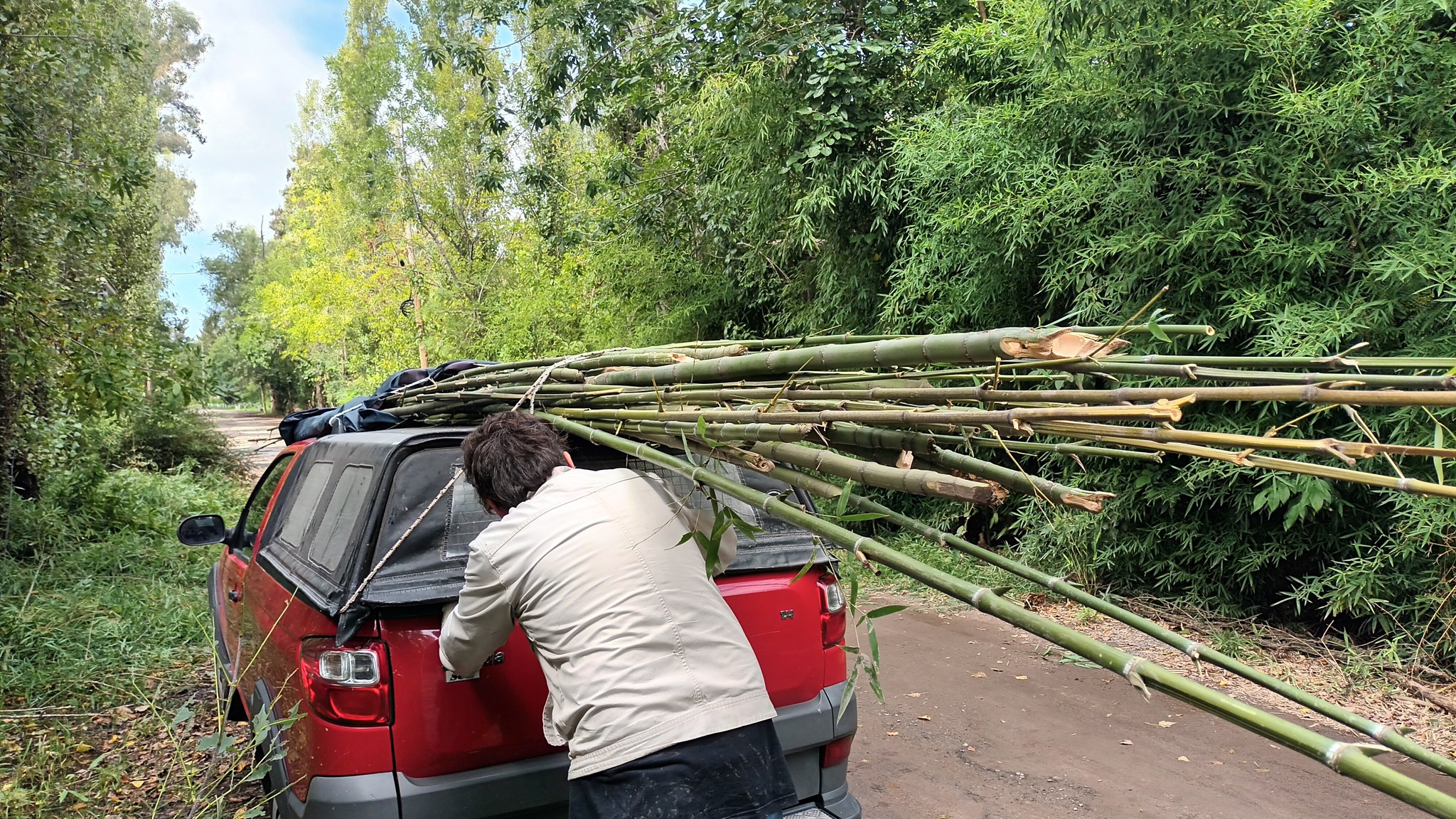 Primero, cortamos cañas dentro de la localidad de Dique Luján y los trasladamos al territorio comunitario con el objetivo de seguir con la construcción de un cerco de fajina para proteger la huerta.