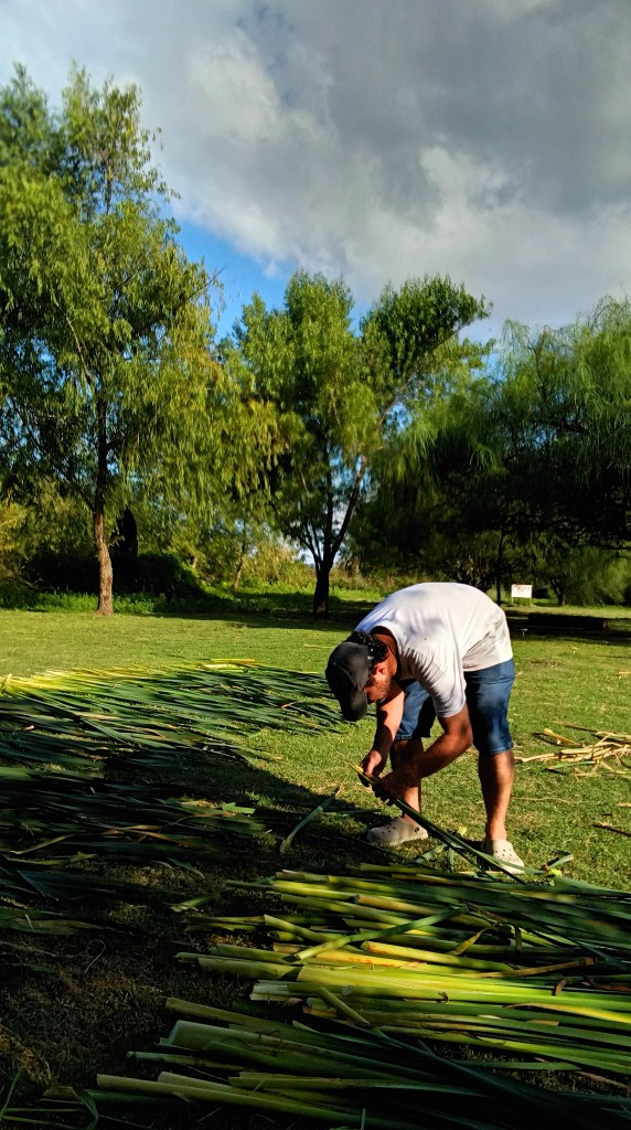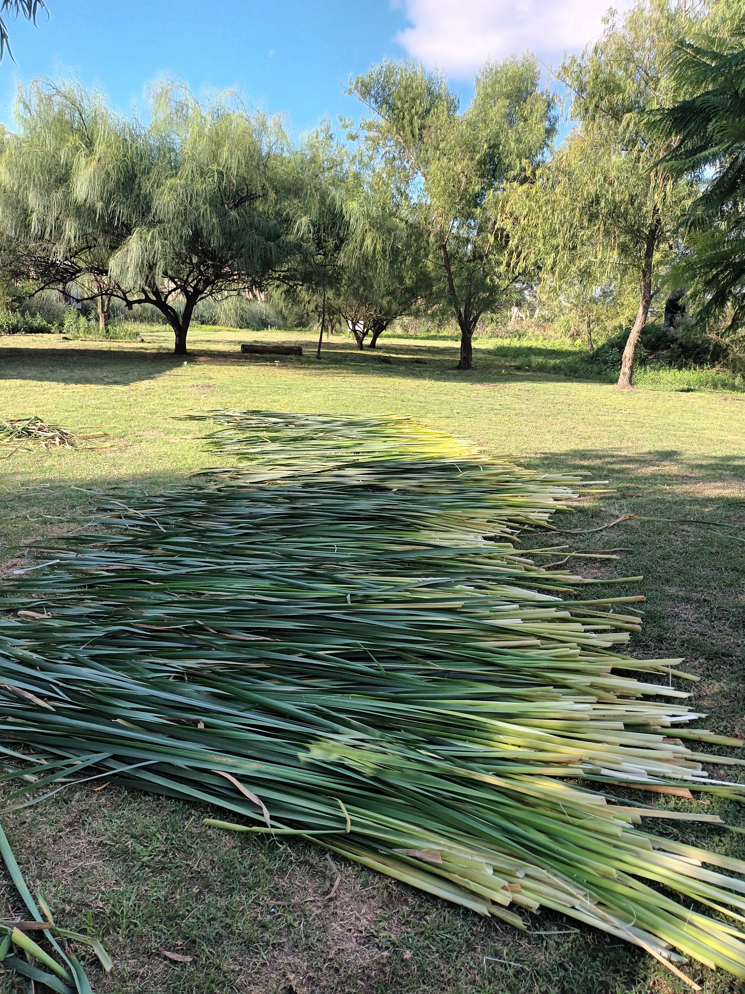 Después, fuimos a cortar totora en las zanjas del barrio San Miguel de Ingeniero Maschwitz. Una vez de regreso a Punta Querandí, abrimos las fibras para ponerlas a secar dentro del Taller.