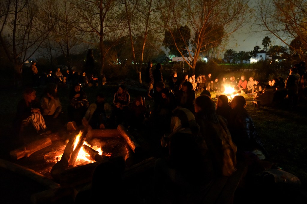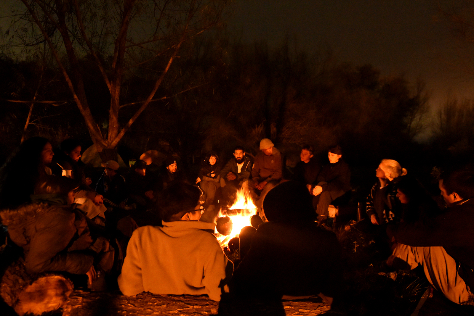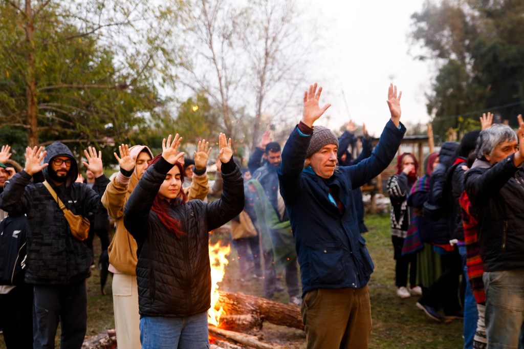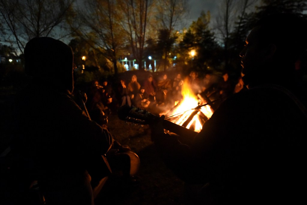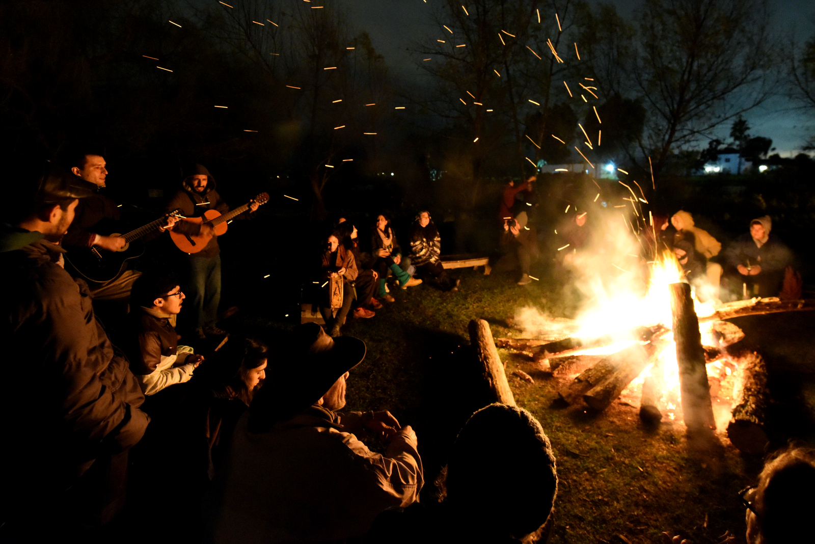 A las 5 de la mañana nos agrupamos en un fogón central con el acompañamiento de distintas músicas y melodías. Sobrellevamos las lloviznas por casi dos horas hasta que, antes de la salida del Sol, hicimos nuevamente una gran ronda.
