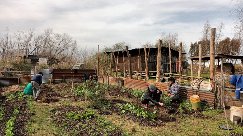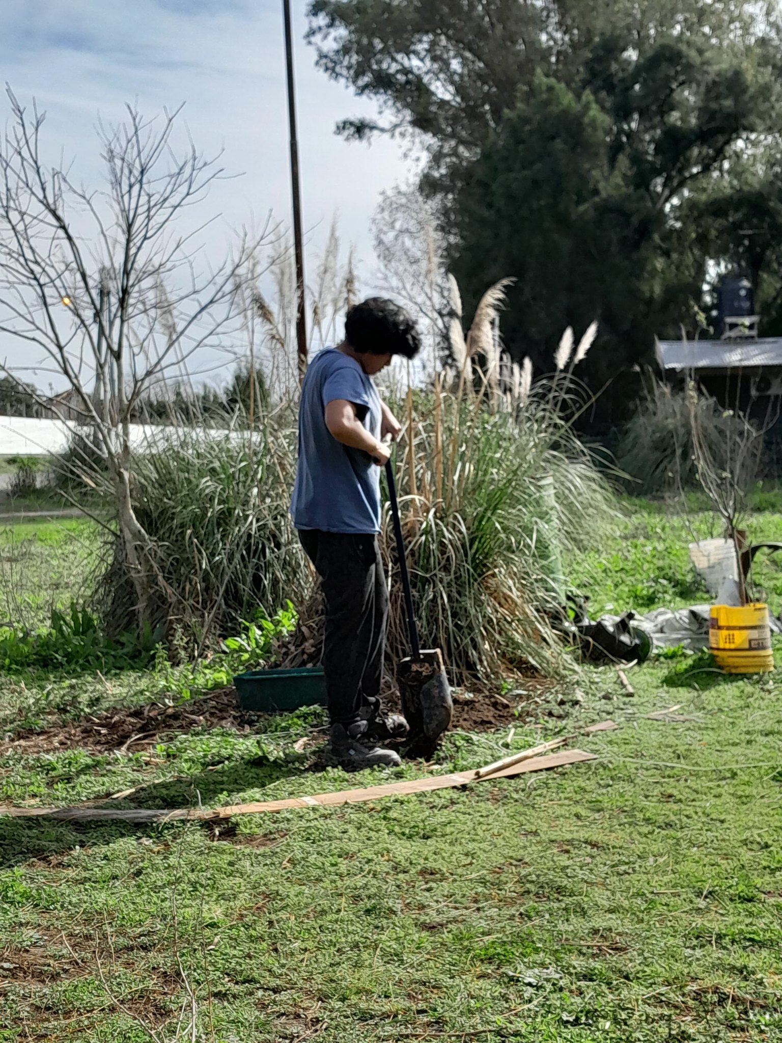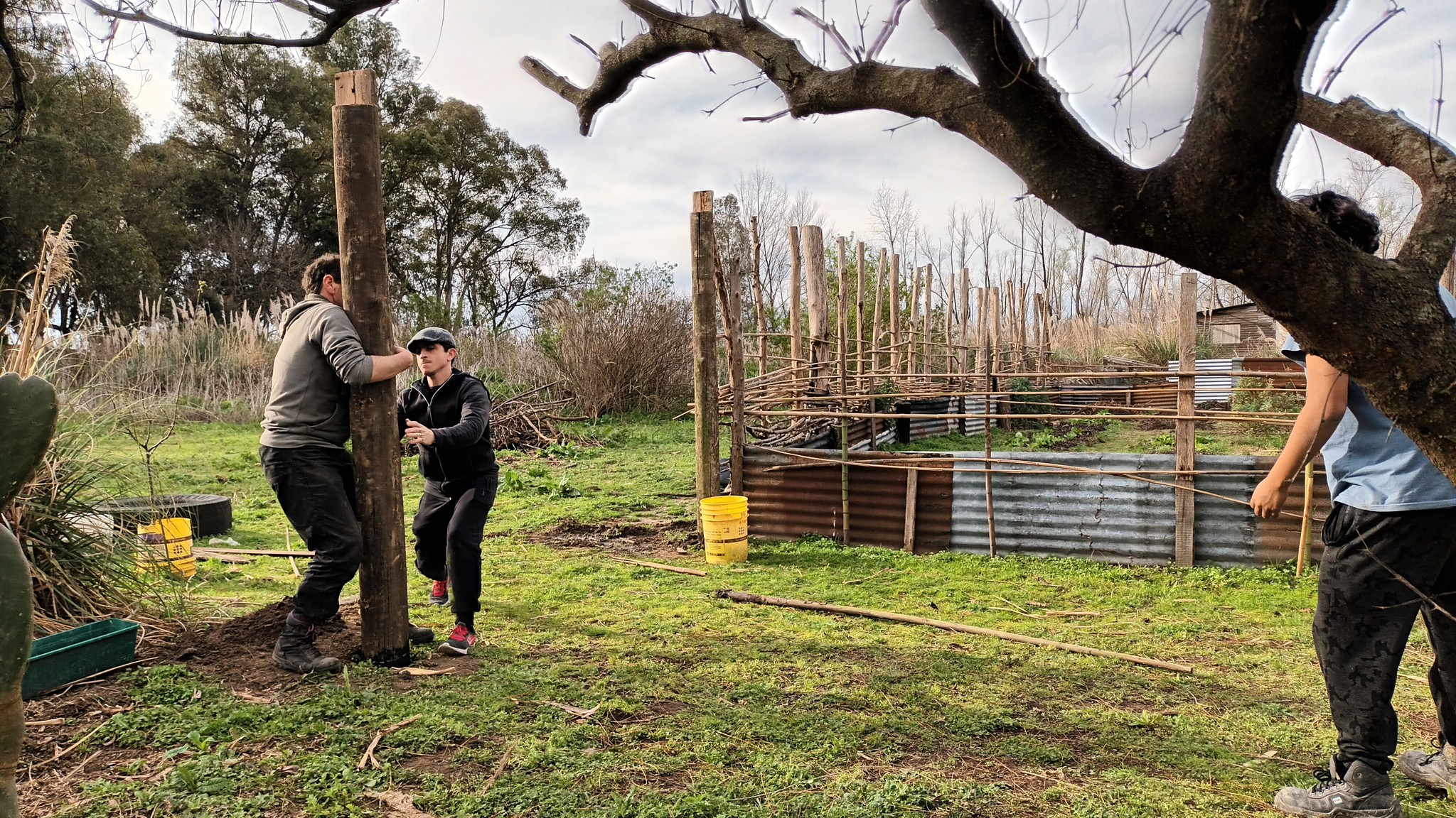 En la huerta hicimos tareas de mantenimiento y comenzamos a reconstruir el vivero: se prepararon los postes para la estructura y se colocaron los primeros.