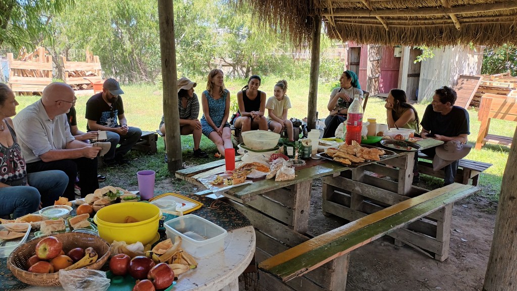 Por su parte, Manuela Ferreira, integrante del Colectivo Colibrí, compartió: «Me maravilló la potencia del trabajo en comunidad, la paz, el respeto y el compromiso con con la tierra y con la gente… venga de dónde venga. Me sentí en familia, recibidos mis hijos y yo como una hermana. La naturaleza parece abrazarlos. Al mismo tiempo son impactantes las imágenes del odio, la ignorancia y el miedo que forman parte del paisaje: los alambrados eléctricos, la vigilancia, las lanchas pasando tan rápido y peligrosamente cerca de la gente que se baña en el río, los paisajes naturales exóticos y ‘barridos’ por un lado, salvajes y exuberantes por el otro».