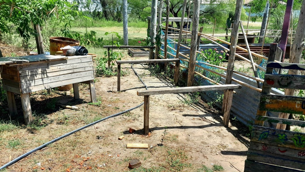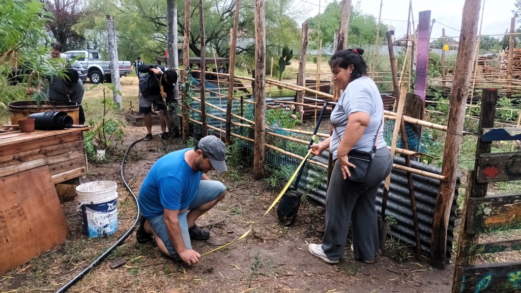 Como venimos comentando, una de las prioridades es mejorar el sistema de riego de la huerta comunitaria. Luego de recuperar tres tanques de agua, estuvimos trabajando en la base de madera donde quedarán instalados.