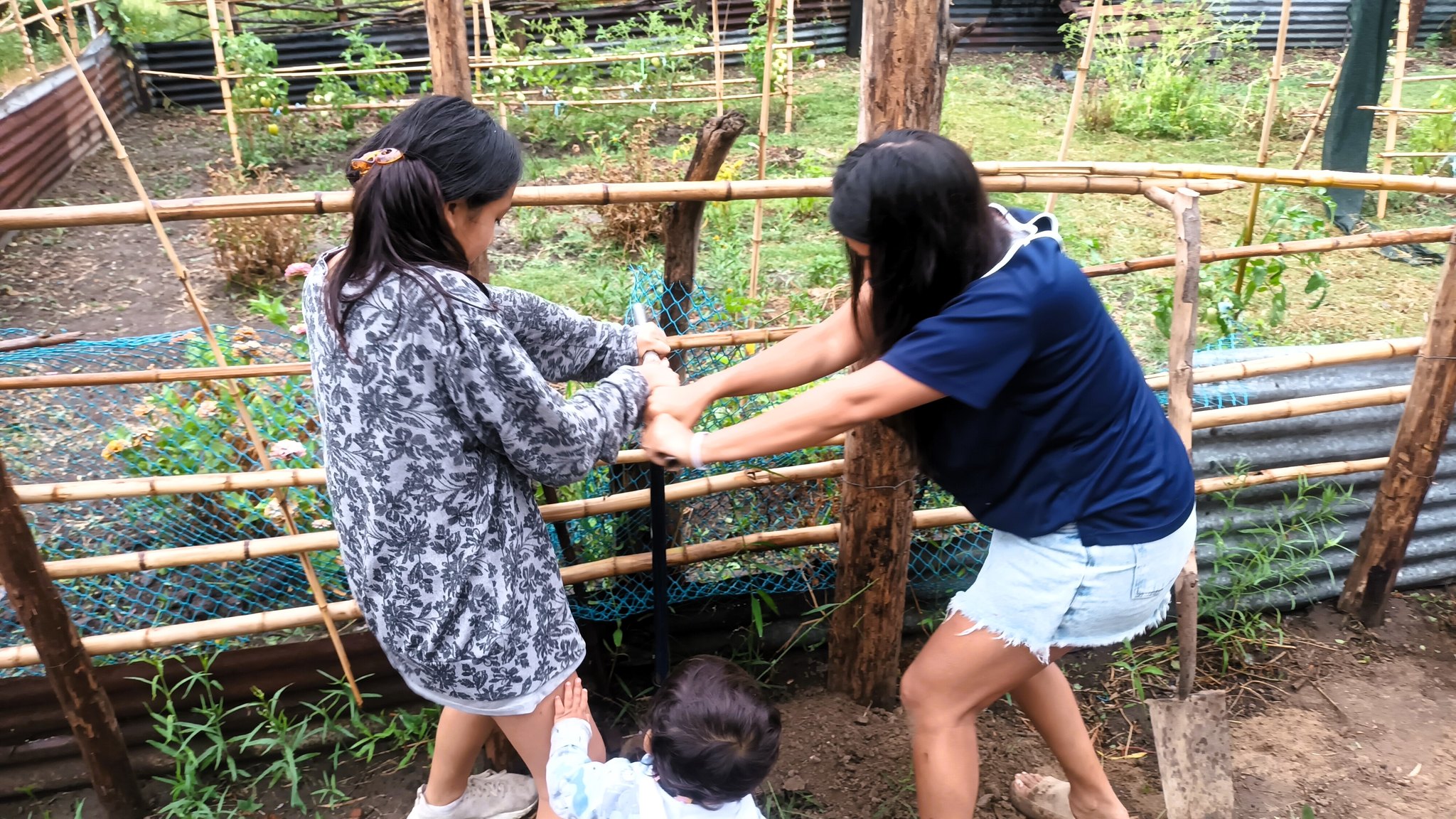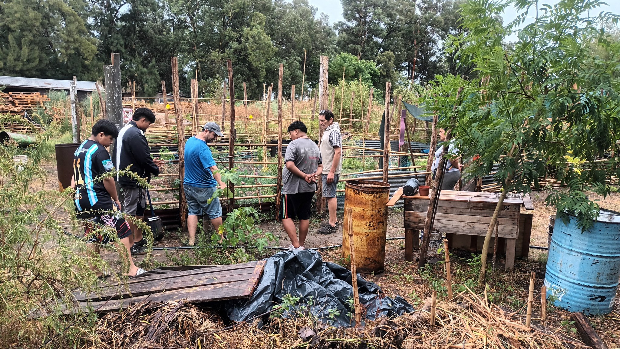 Como venimos comentando, una de las prioridades es mejorar el sistema de riego de la huerta comunitaria. Luego de recuperar tres tanques de agua, estuvimos trabajando en la base de madera donde quedarán instalados.