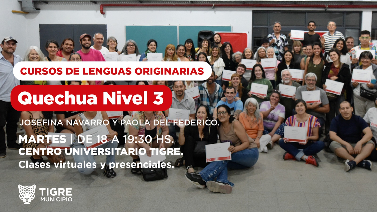 Este viernes 21 de marzo, a las 19hs, compartiremos una jornada virtual con la presencia del cuerpo docente de los 8 cursos de quechua, guaraní, qom y moqoit, autoridades de la Unión de Pueblos Originarios de Tigre y Escobar y representantes del Municipio.