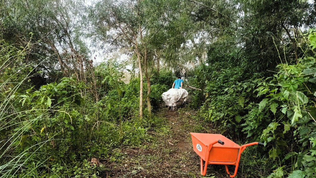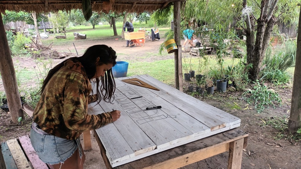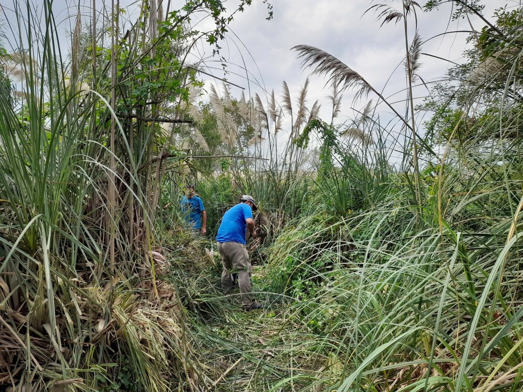 El siguiente fin de semana, el domingo 23 de marzo, también tuvo un clima lluvioso. Como ya se acercan las fechas de visitas escolares, la prioridad fue limpiar y mejorar los senderos. También comenzamos a pintar un nuevo cartel que será el primero que instalaremos para señalizar el territorio desde el rio.