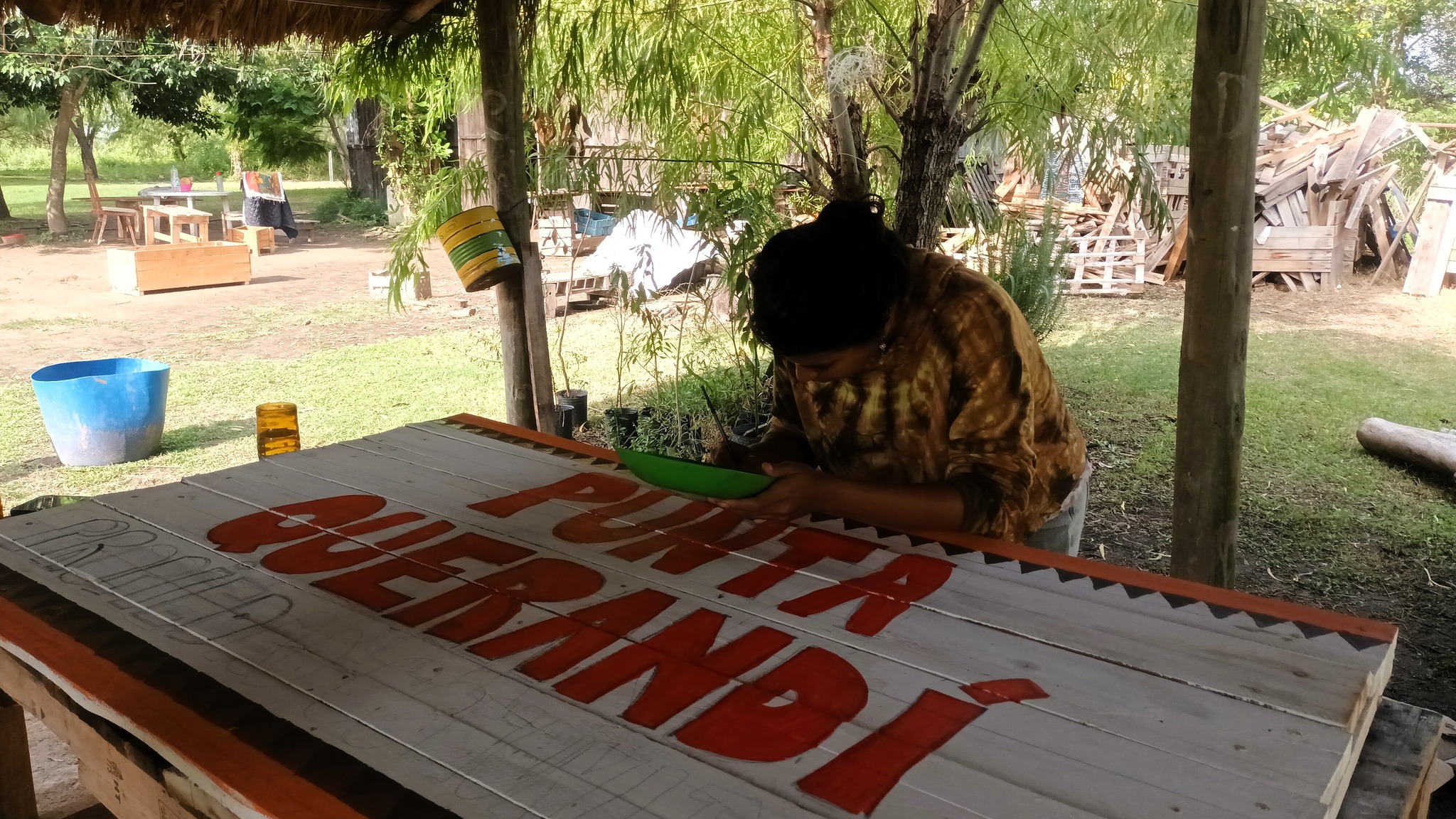 El siguiente fin de semana, el domingo 23 de marzo, también tuvo un clima lluvioso. Como ya se acercan las fechas de visitas escolares, la prioridad fue limpiar y mejorar los senderos. También comenzamos a pintar un nuevo cartel que será el primero que instalaremos para señalizar el territorio desde el rio.