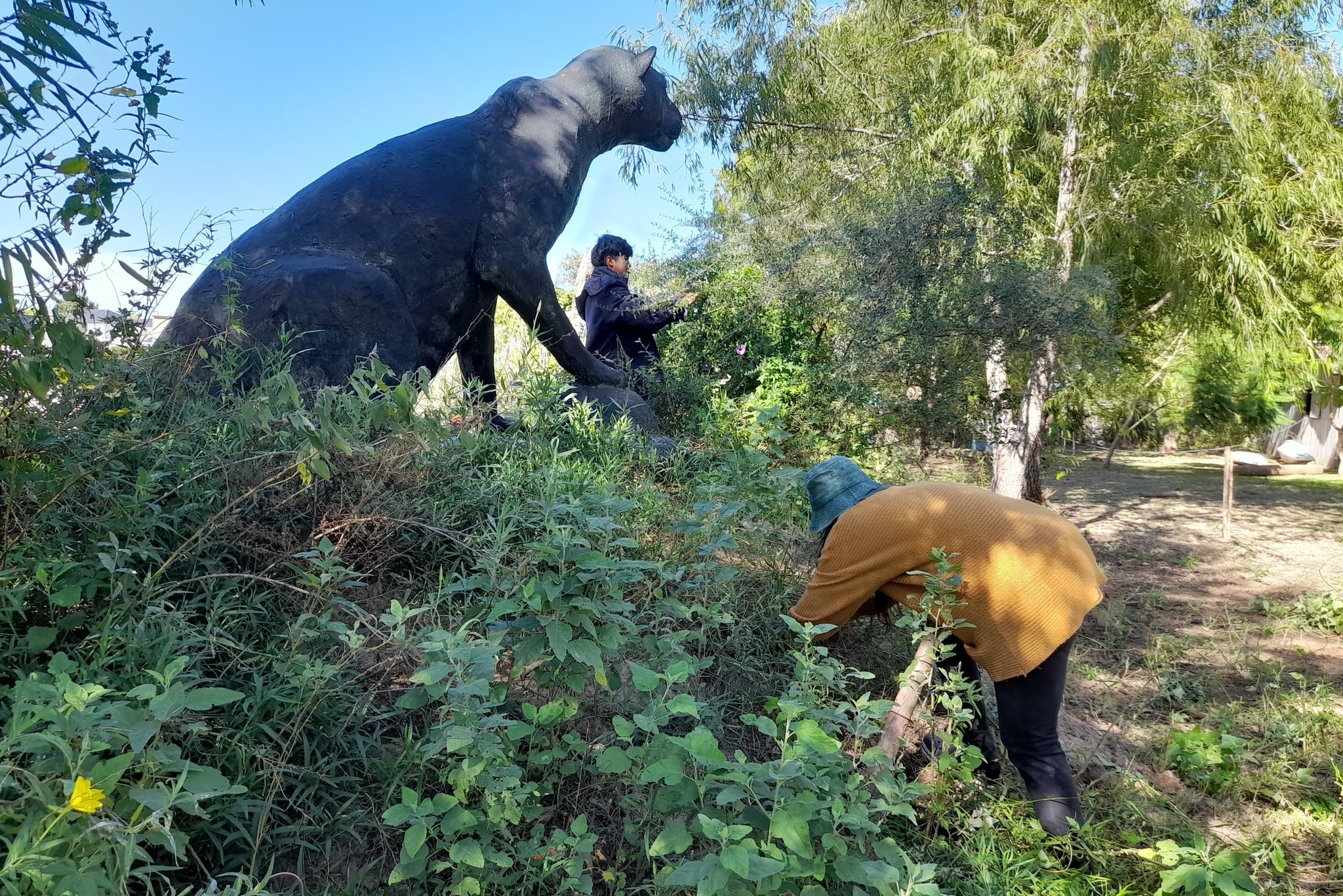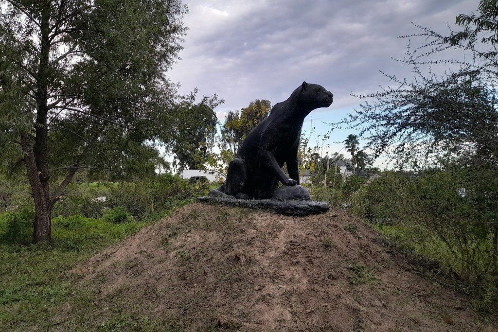 Uno de los tantos atractivos del territorio es el Monumento a la Yaguareté, primer homenaje en Tigre a este animal sagrado de las culturas ancestrales en todo el continente. Nuestra «guardiana» muy pronto recibirá el mantenimiento que todos los años realizan sus creadores, José Luis Gómez, Virginia Gómez y Alejandra Monteverde. Mientras tanto, hicimos un corte de pasto y yuyos alrededor de la estructura.