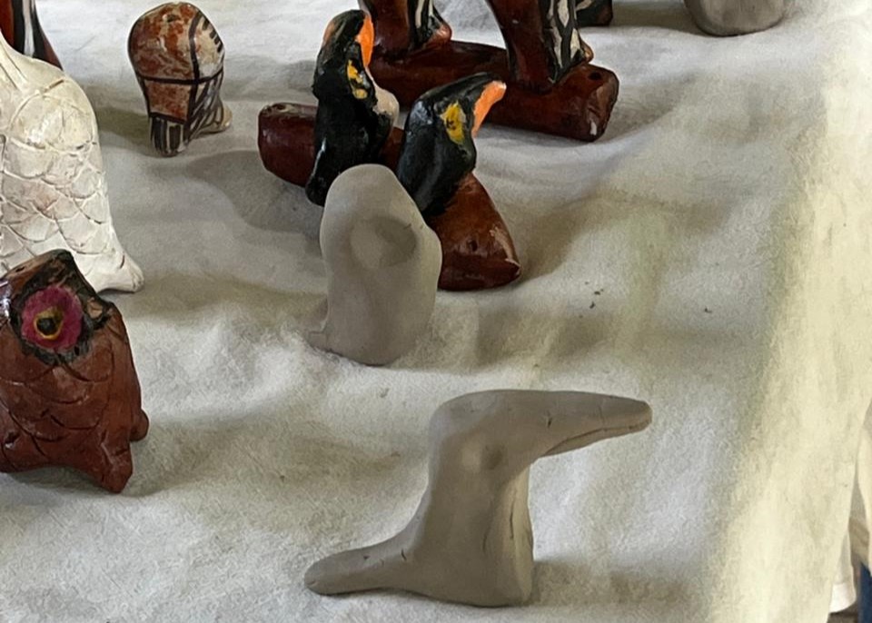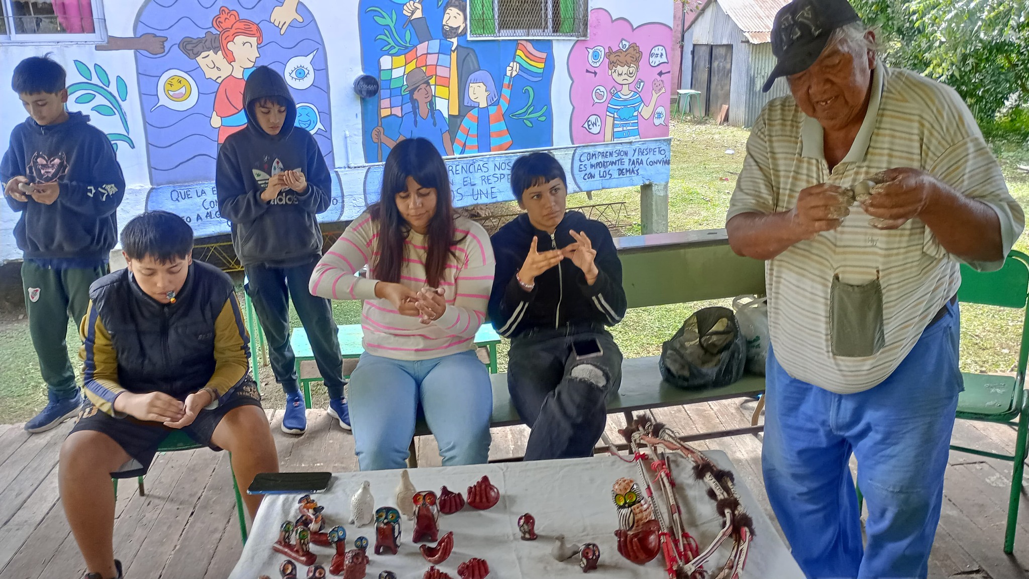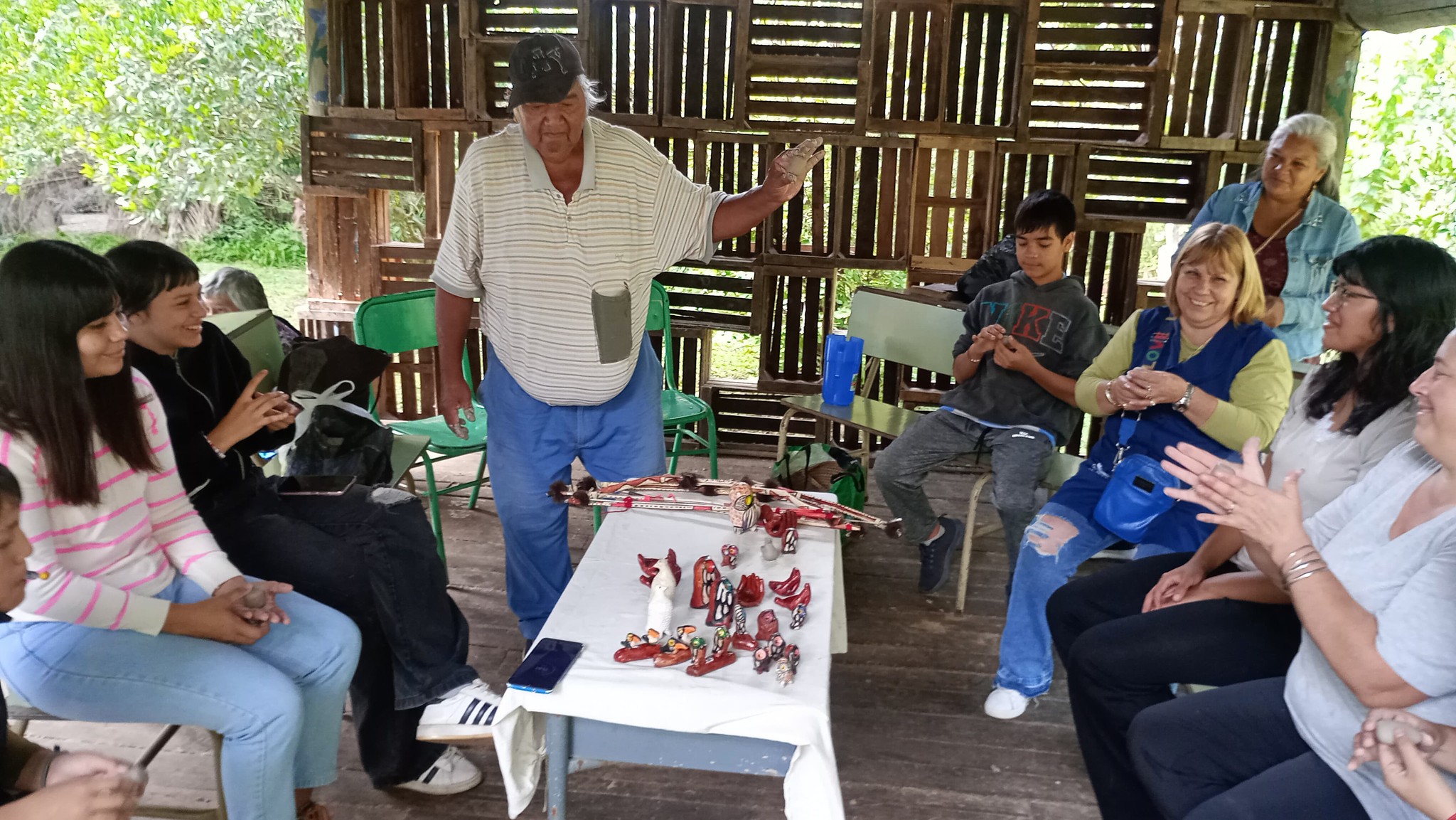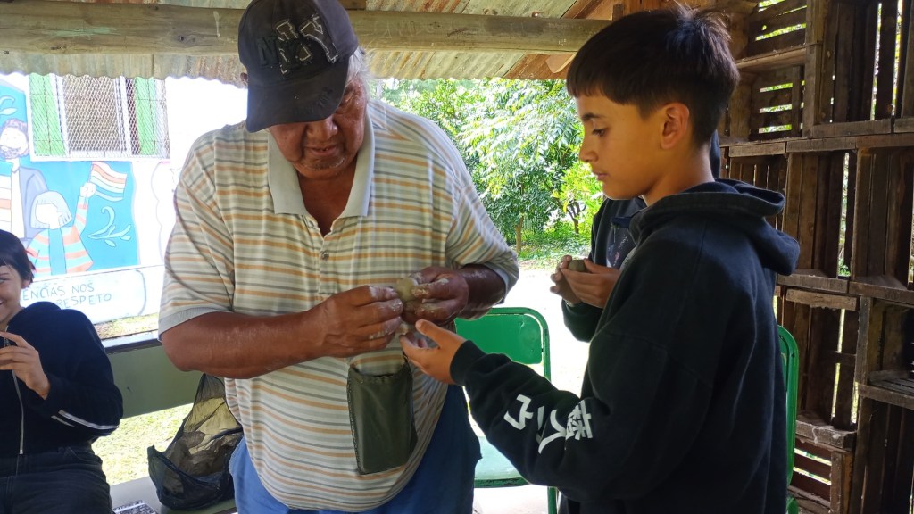 Primero se realizó una charla en el comedor de la escuela y después se hizo un taller de cerámica en el parque bajo un quincho, a cargo de Amancio Rojas, para un grupo más reducido de personas.