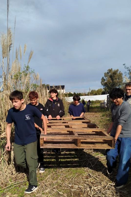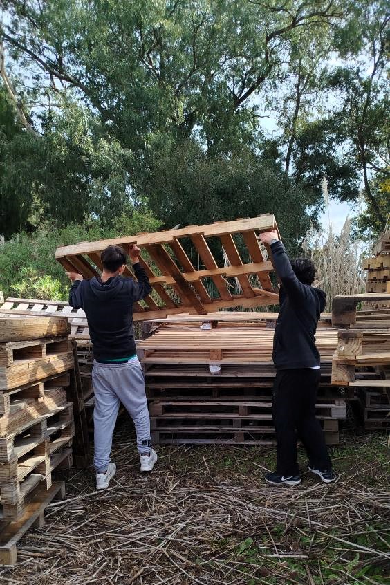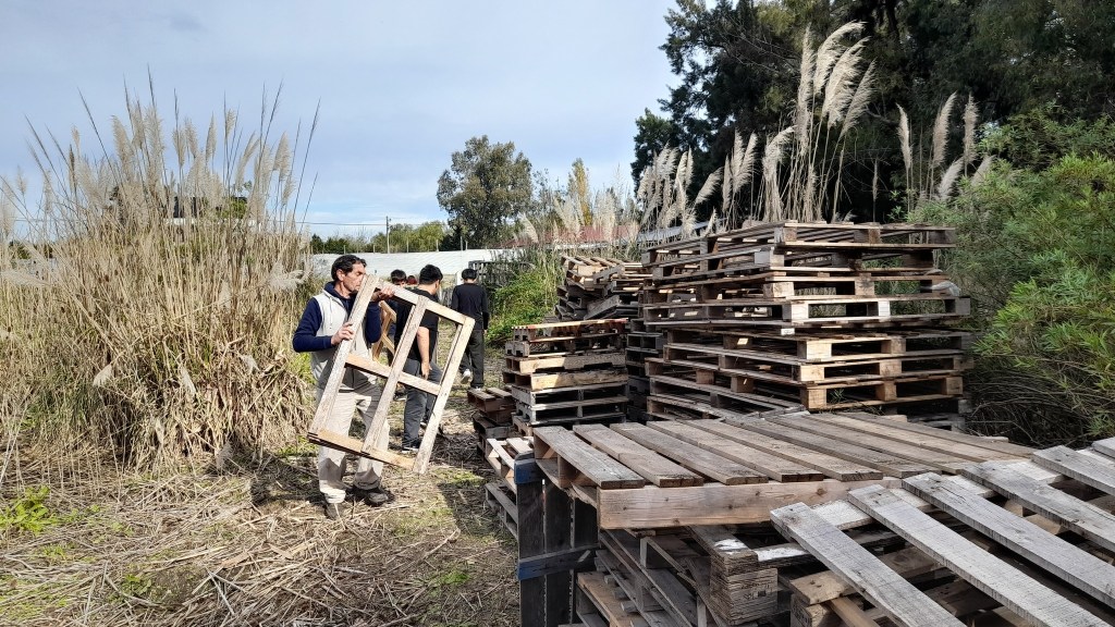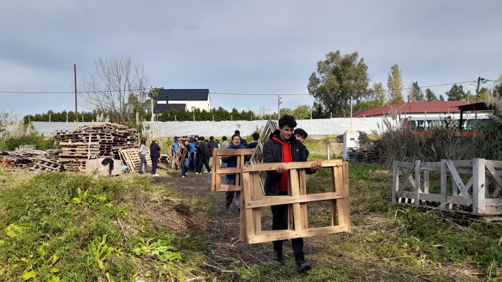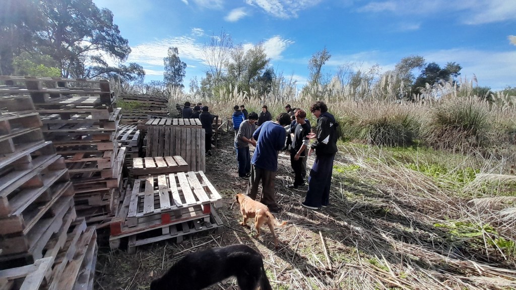 Después de una pausa para compartir el almuerzo, los chicos y chicas sumaron sus manos a una de las prioridades del territorio en esos días: terminar de mover una cantidad importante de palets para despejar un sector donde se planifica avanzar con un proyecto de frutales.