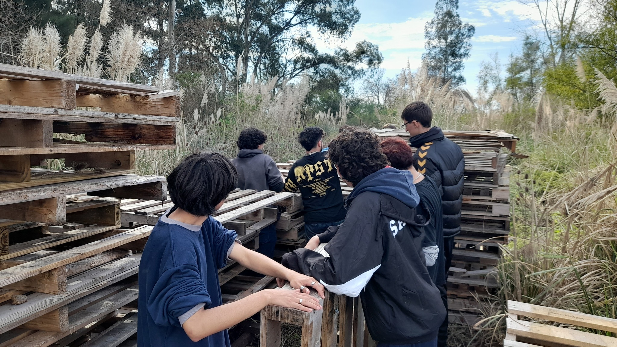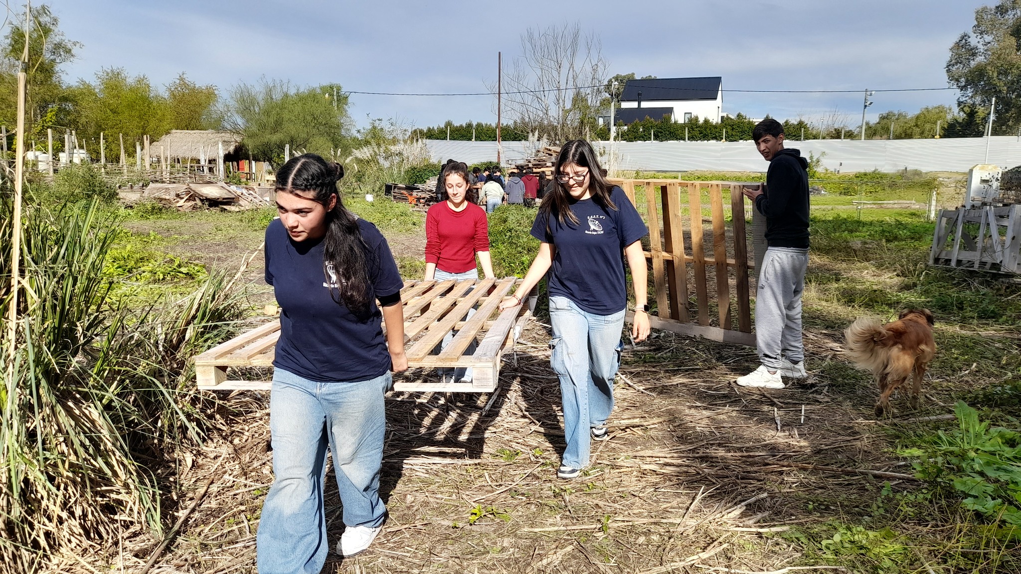 Después de una pausa para compartir el almuerzo, los chicos y chicas sumaron sus manos a una de las prioridades del territorio en esos días: terminar de mover una cantidad importante de palets para despejar un sector donde se planifica avanzar con un proyecto de frutales.