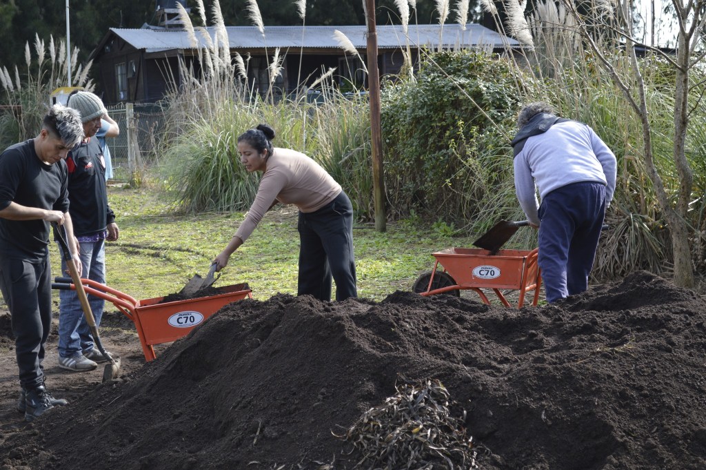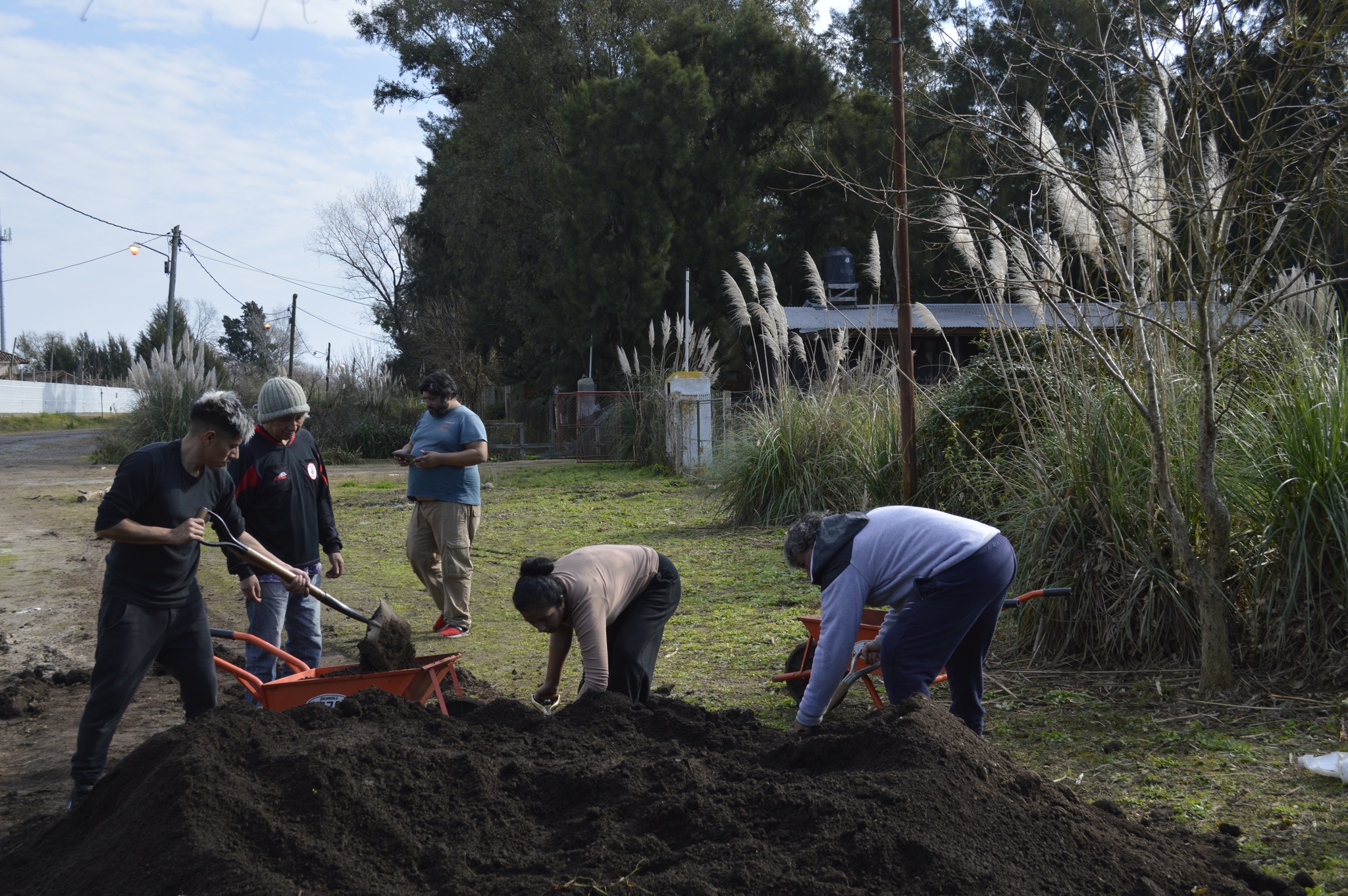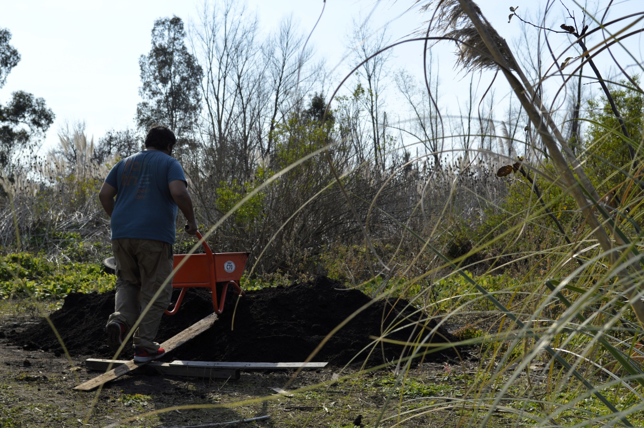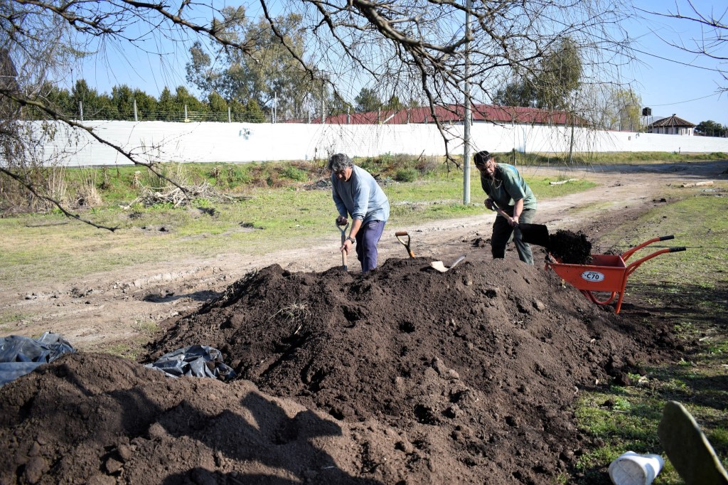 Desde la mañana, trabajamos con palas y carretillas para reubicar al lado de la huerta los 12 metros cúbicos de compost donados por CEAMSE y comenzamos a usar este material.