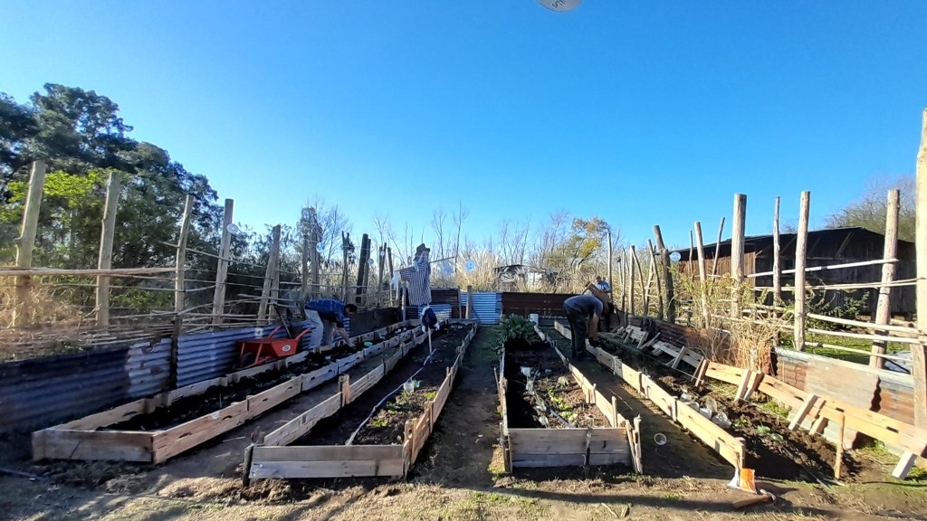 El domingo 13 de julio el trabajo más fuerte estuvo centrado en la huerta: continuamos con el armado de contenedores de madera para los bancales y seguimos usando el compost donado por el CEAMSE para fortalecer lo sembrado.