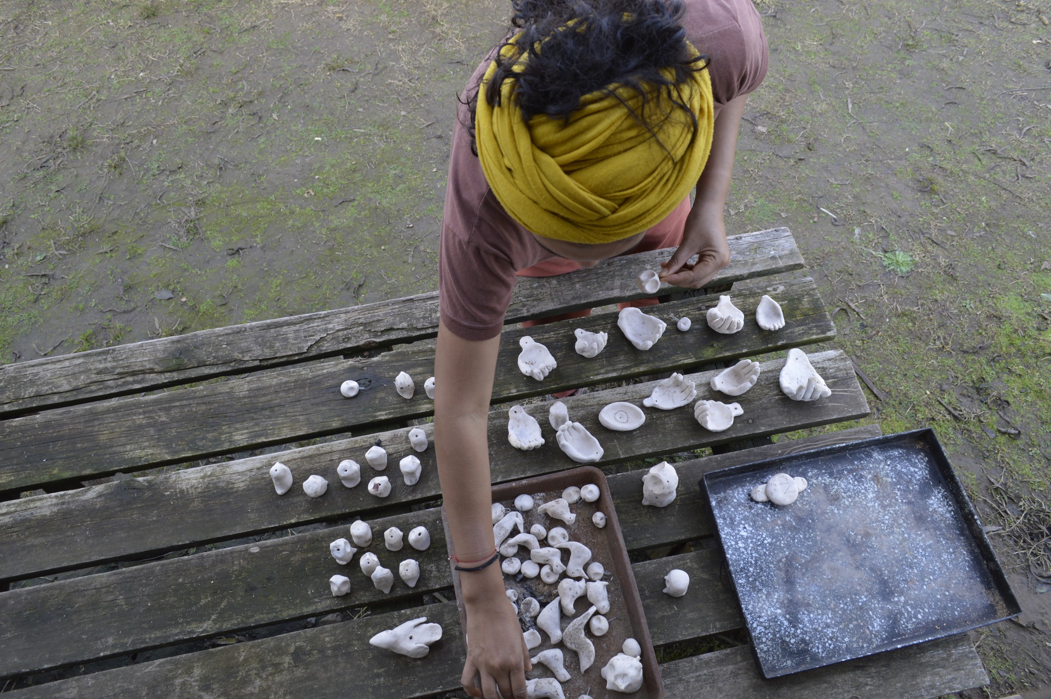 La primera etapa del taller de cerámica toba-qom se realizó el domingo 25 de mayo, con la asistencia de personas de distintos lugares del conurbano bonaerense que elaboraron piezas con cuatro variedades: collar de lechuzas, lechuza, manito y palomita.