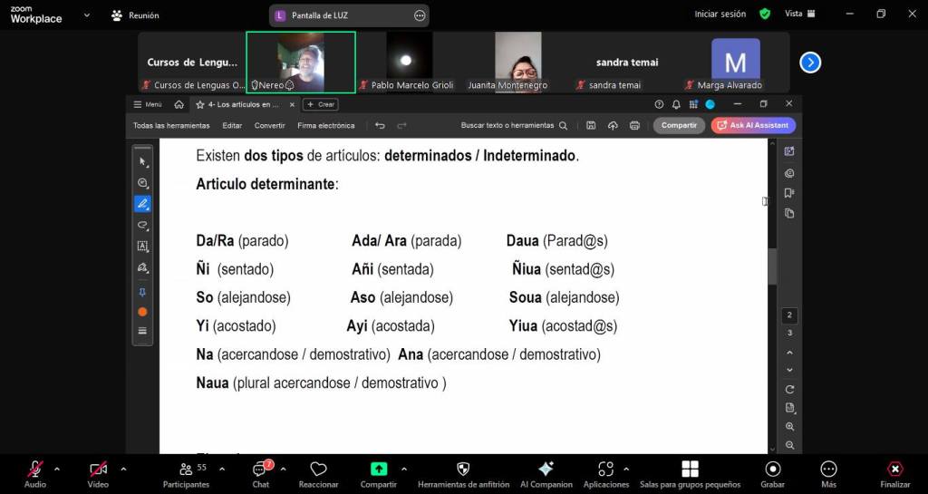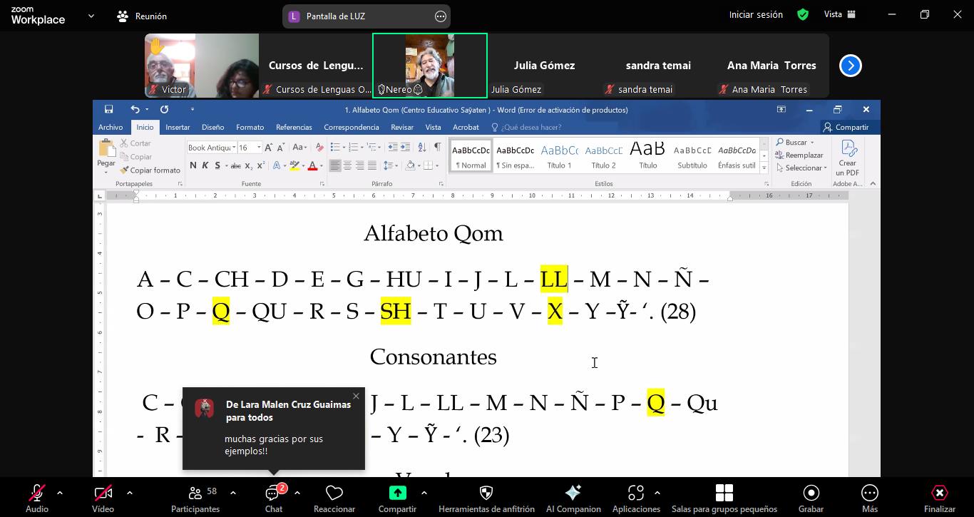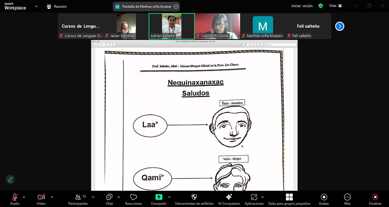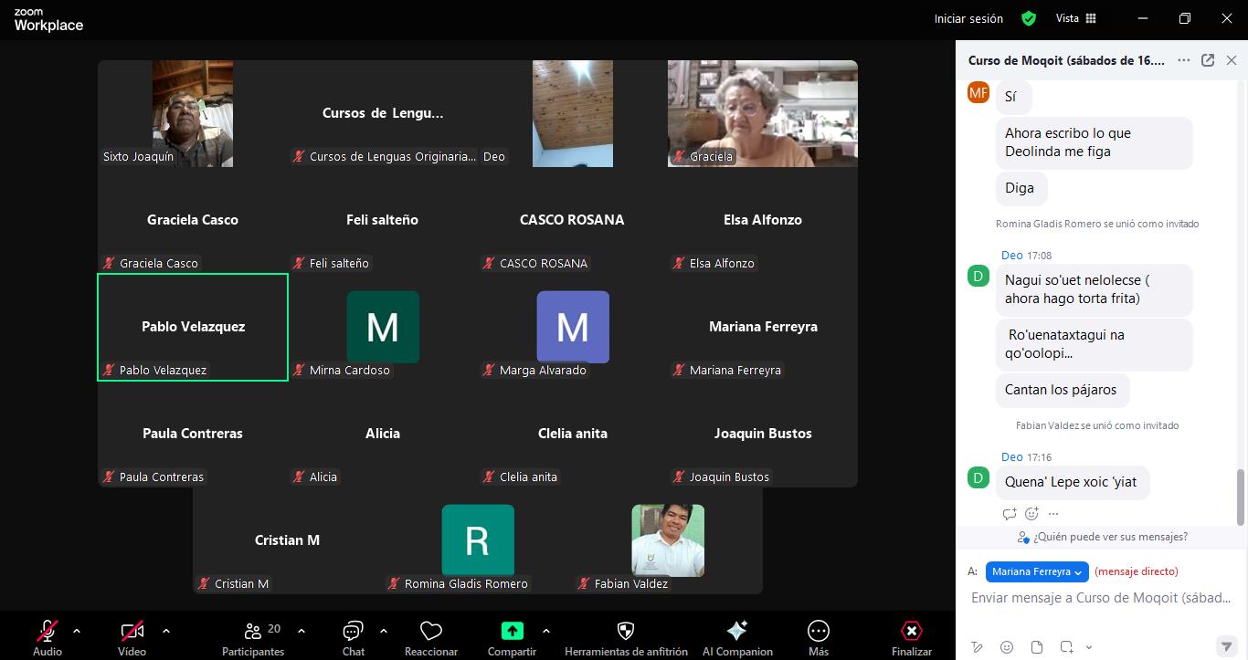 Las clases de qom y moqoit fueron los días sábados con la característica de ser 100% virtuales desde Chaco, con el paxaguenataxanaxaic (profesor) Mario «Nereo» Charole los jueves y la napaxguinataxanaxa (profesora) Deolinda Salteño; él desde Villa Río Bermejito y ella desde la zona cercana a Villa Angela en el sur de esa provincia.