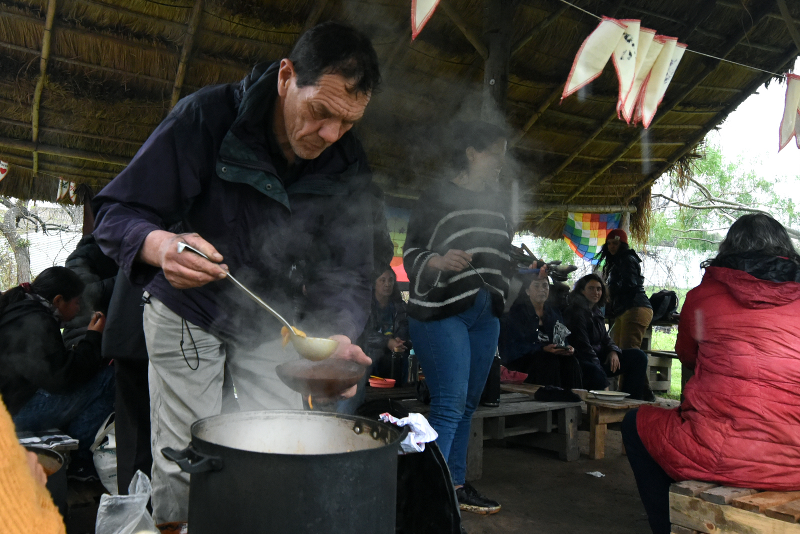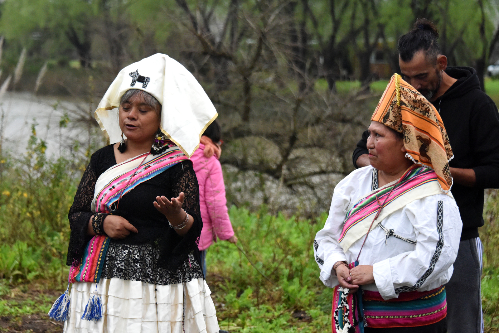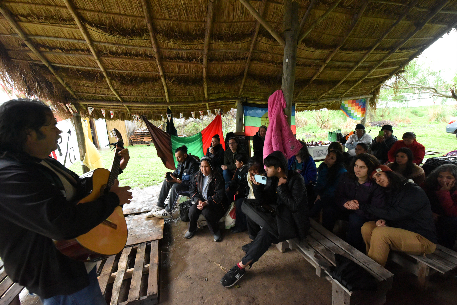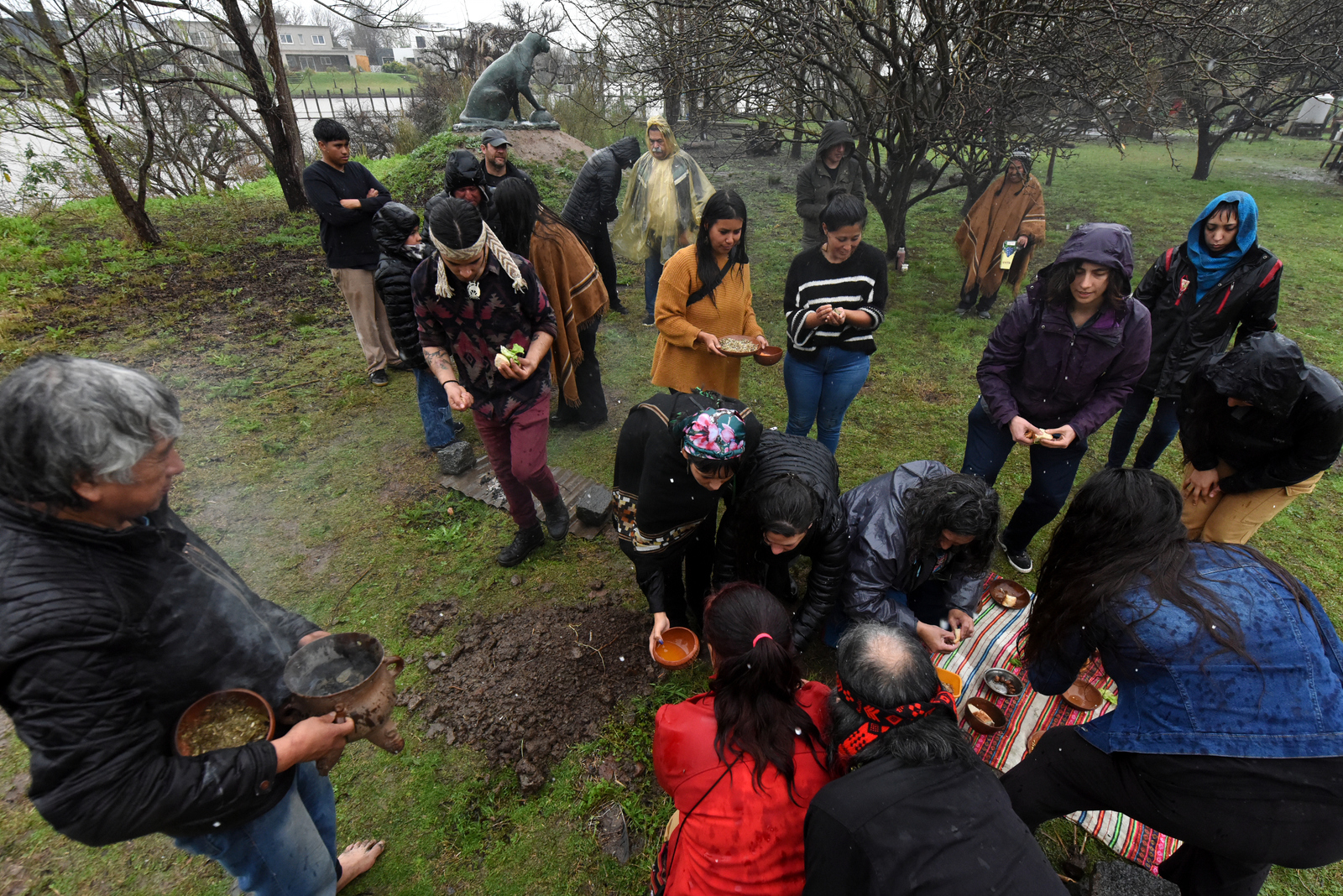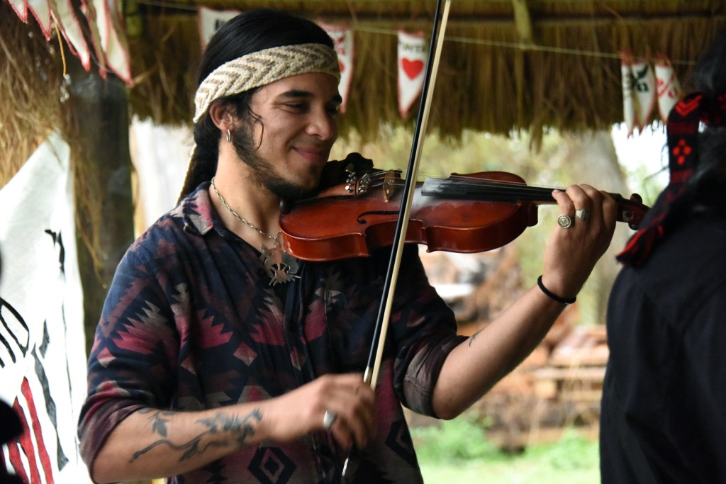 “Nosotros la pasamos recontra bien con el agua, la lluvia, el barro, el río, toda la biodiversidad de ahí”, comentó´ Miguel ‘Cheuke’ Ferreyra, integrante del Pueblo Mapuche y miembro de la Comunidad Pluriétnica Tres Ombúes de La Matanza, una de las personas que asumieron la jornada con naturalidad. Además de su música, trajo para exponer y vender parte de su obra como orfebre.