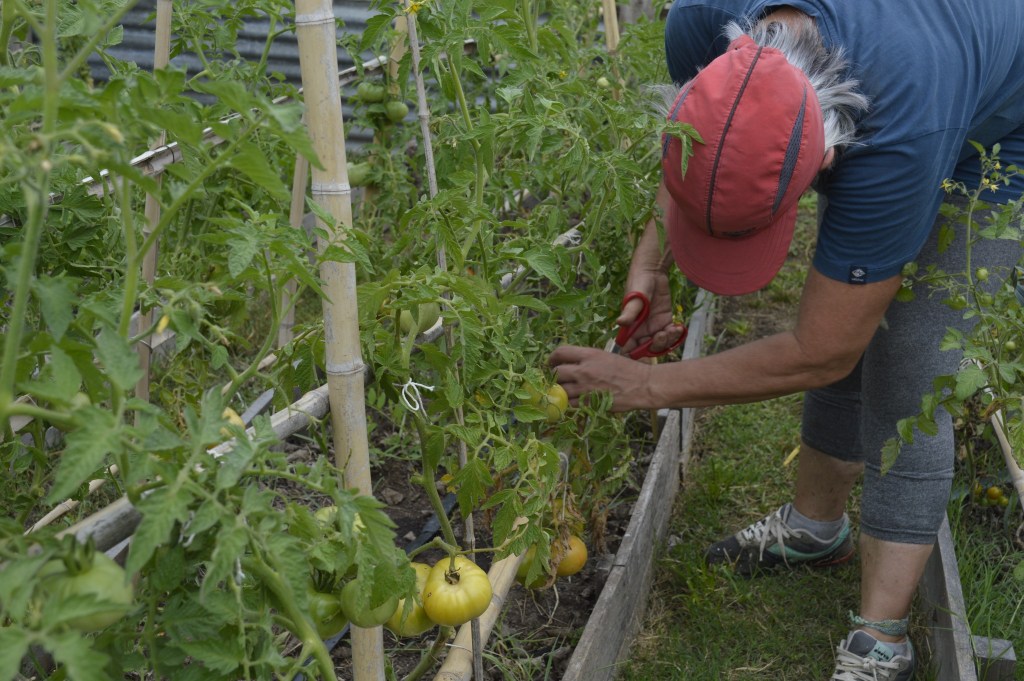 El siguiente domingo 7 de diciembre, la jornada tuvo varios frentes. En la huerta se ampliaron las estructuras de las tomateras y se desyuyaron los bancales. Además se cosecharon tomates y lechugas. También se hicieron algunos ajustes en el sistema de riego.