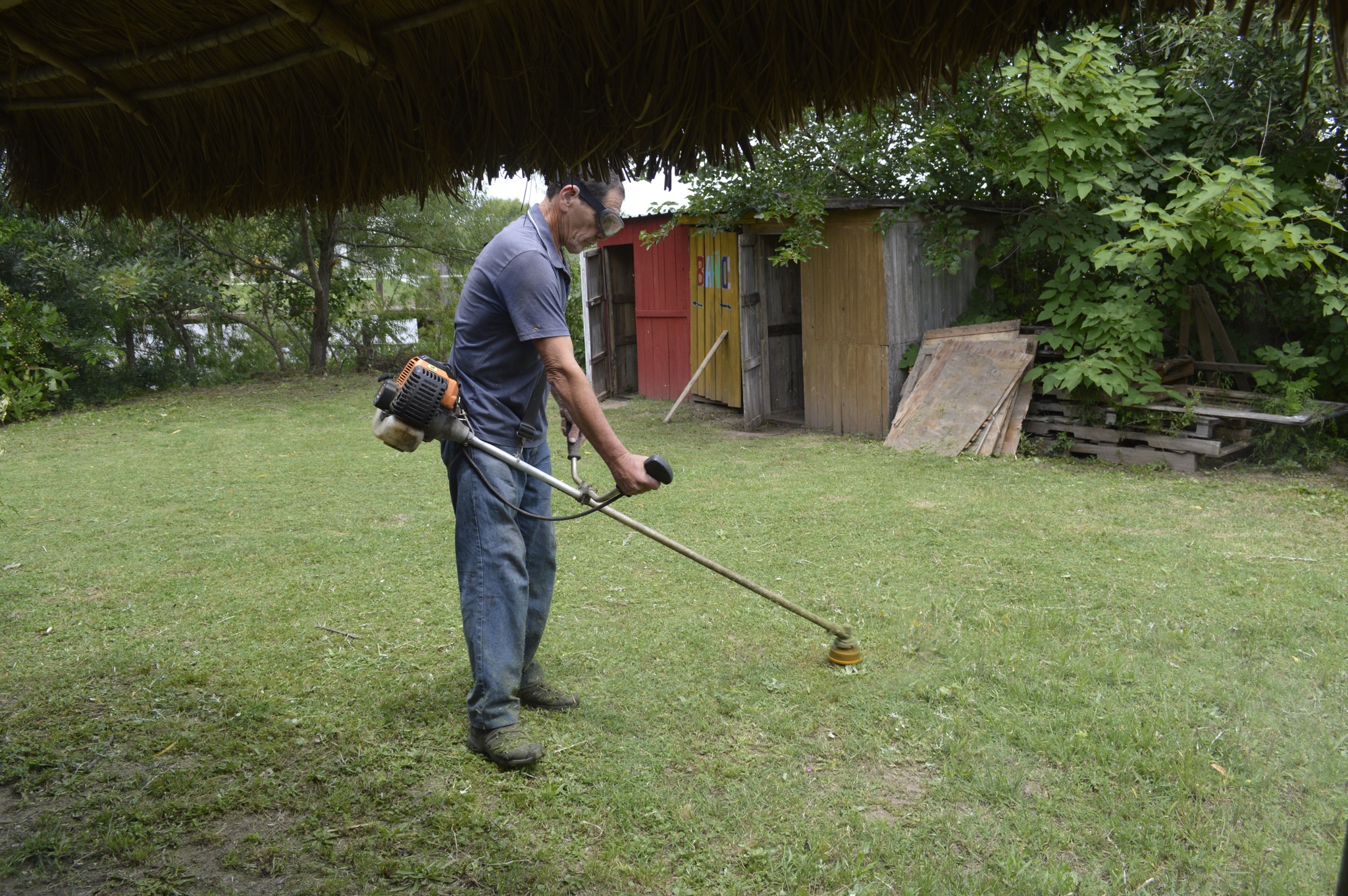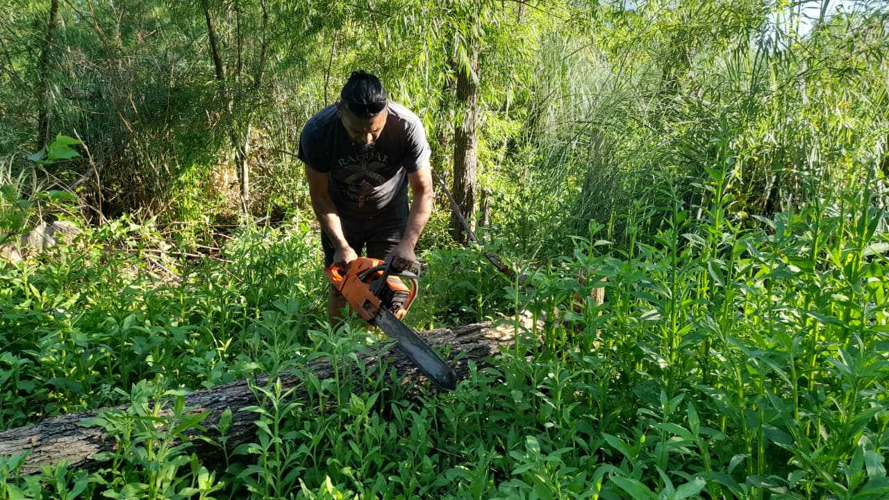 Otra tarea fue cortar el pasto con la desmalezadora. Así mismo, a machete cortamos ramas grandes de sauce para usar en el mantenimiento de la Maloka, uno de los próximos objetivos.