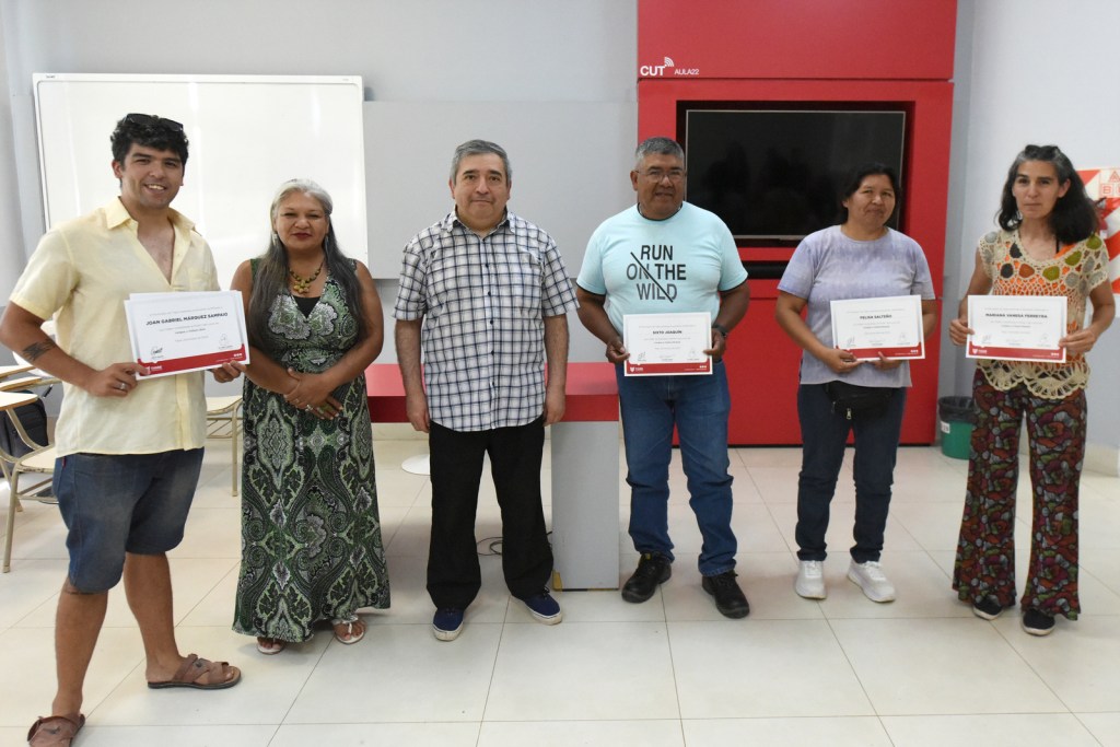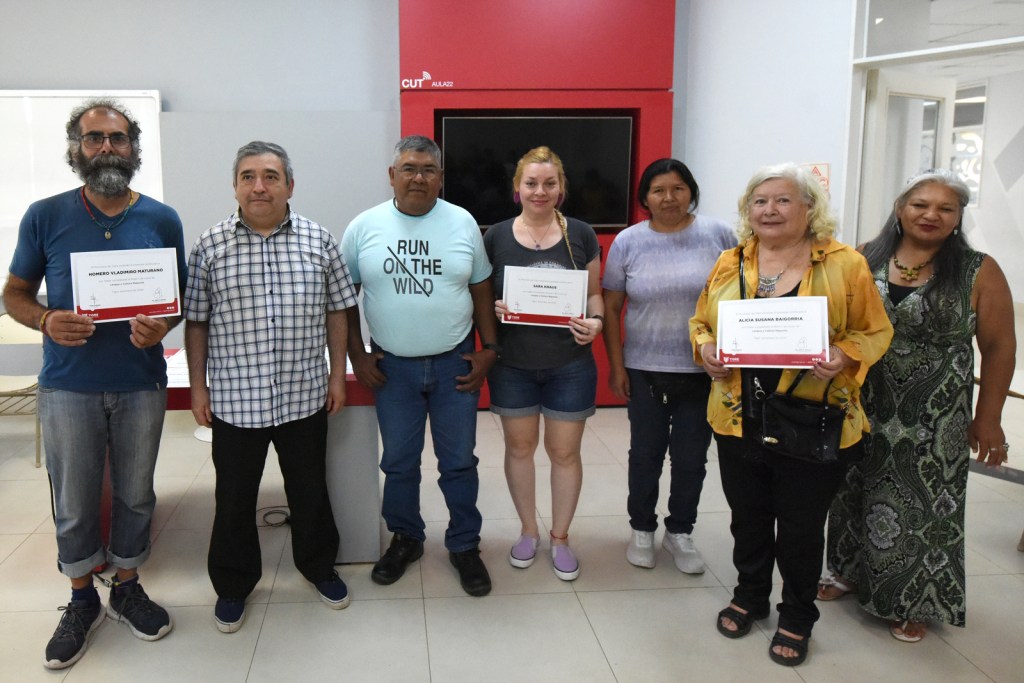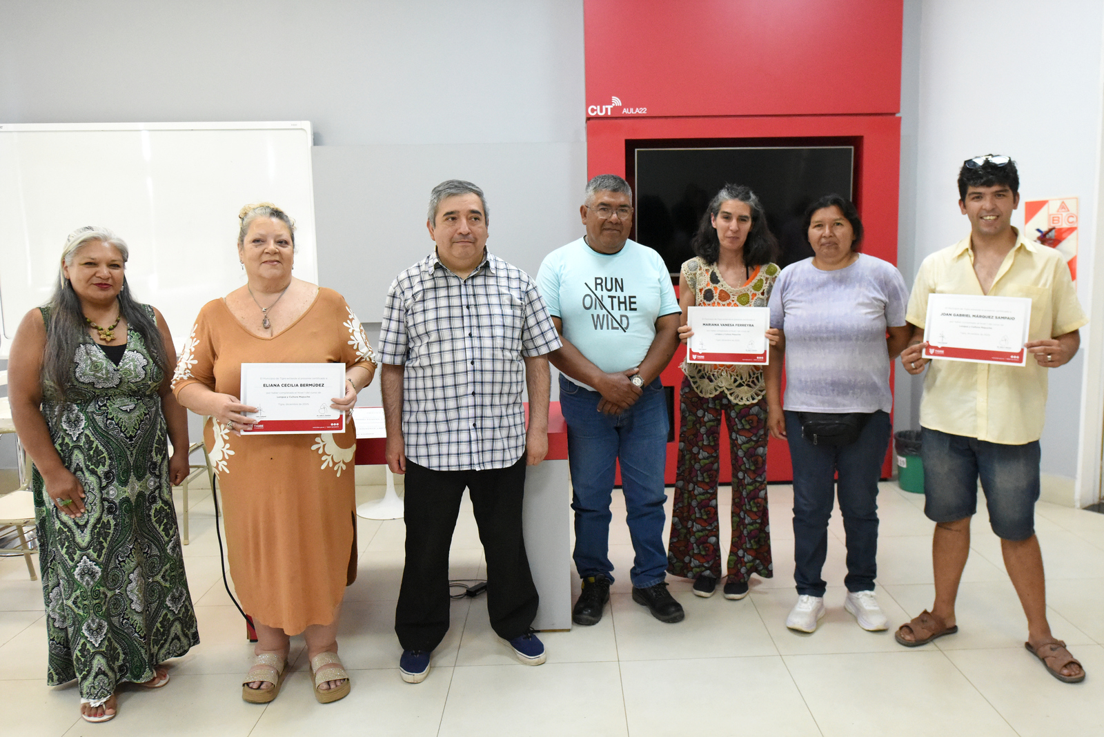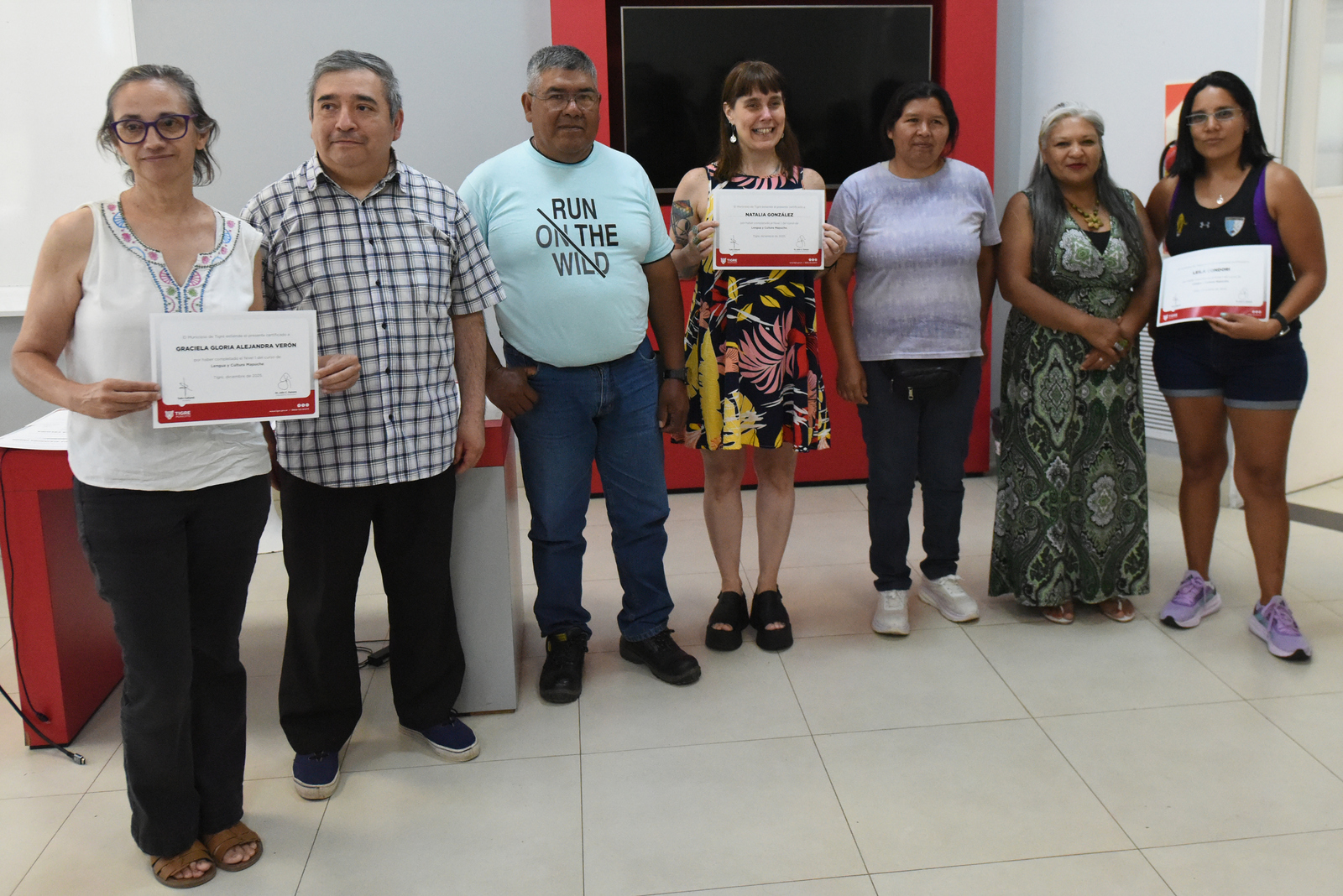 Acompañaron el acto de entrega de certificados el kimelfe (profesor) Tulio Cañumil; y en representación de la Unión de Pueblos Originarios, la cacica Cintia Lopez de la Comunidad Qompí «Hermanos/as tobas», así como Felisa Salteño y el cacique Sixto Joaquín de la Comunidad Moqoit del Delta, quienes también entregaron algunos certificados del curso de moqoit.