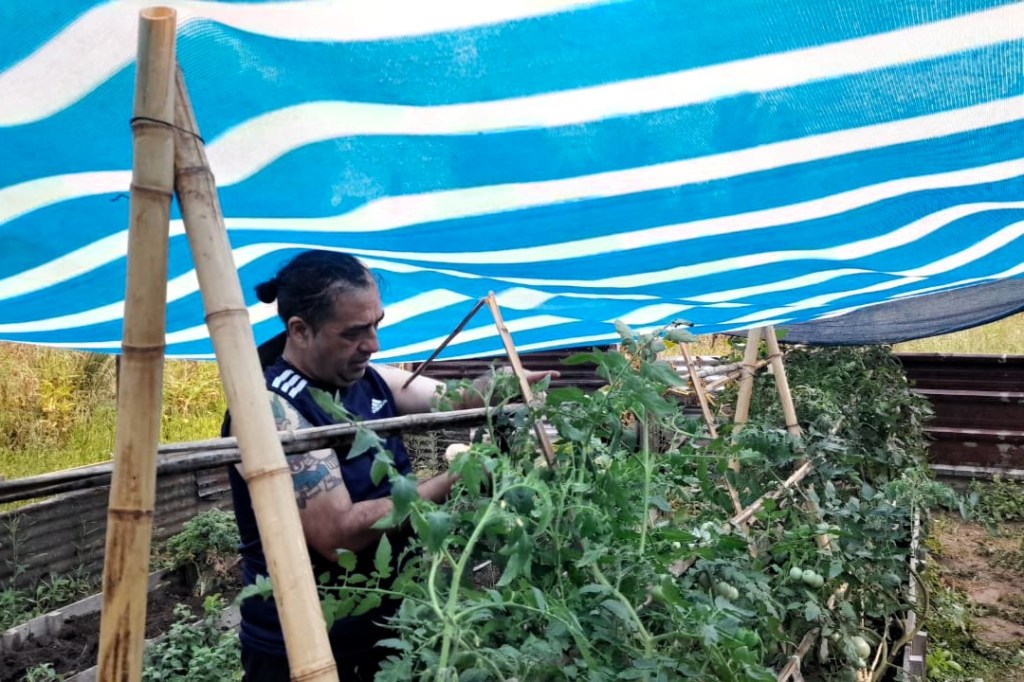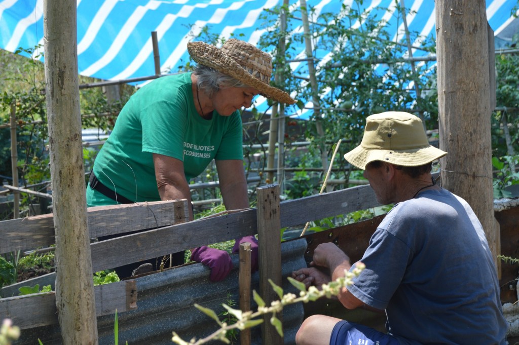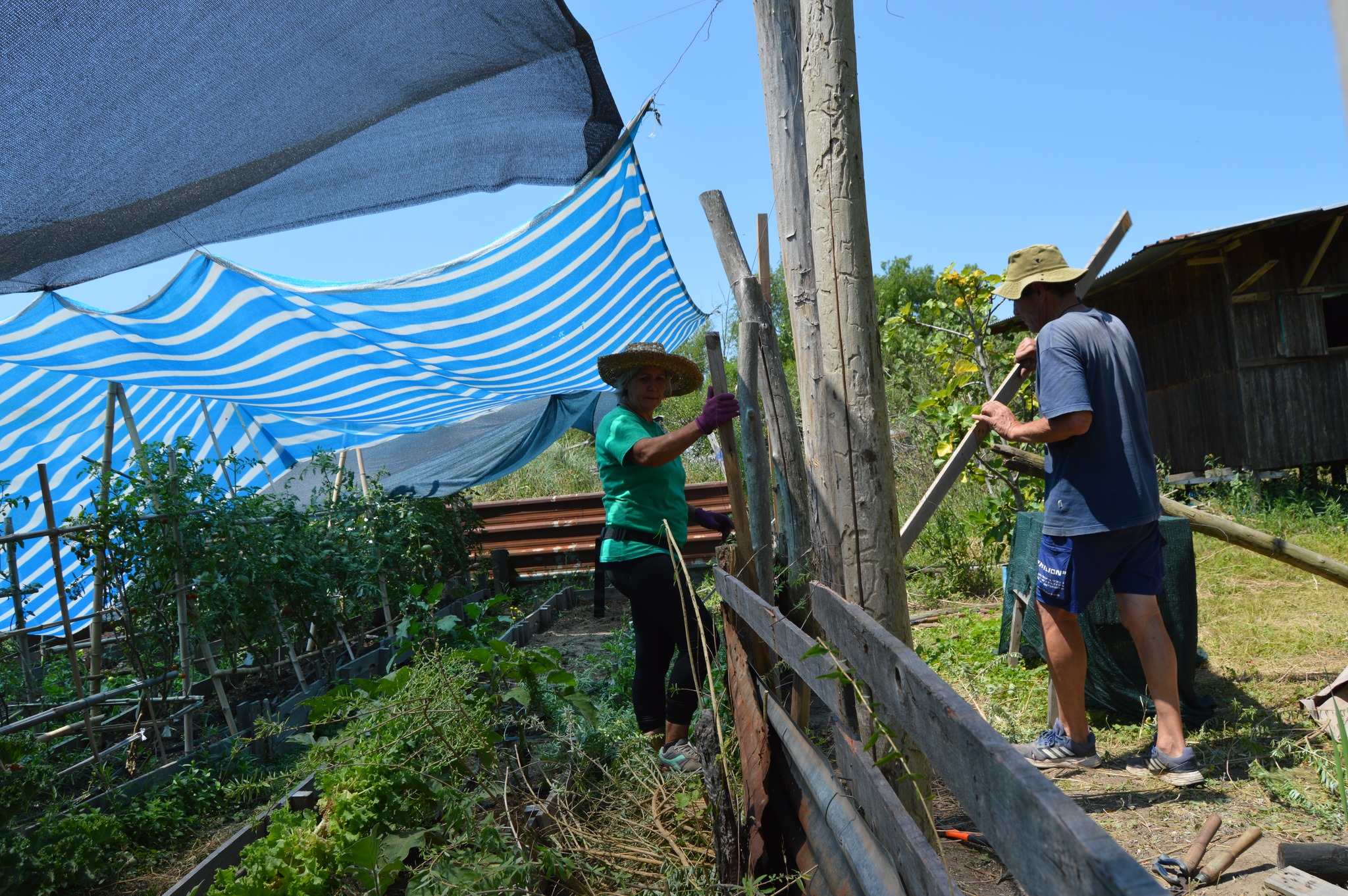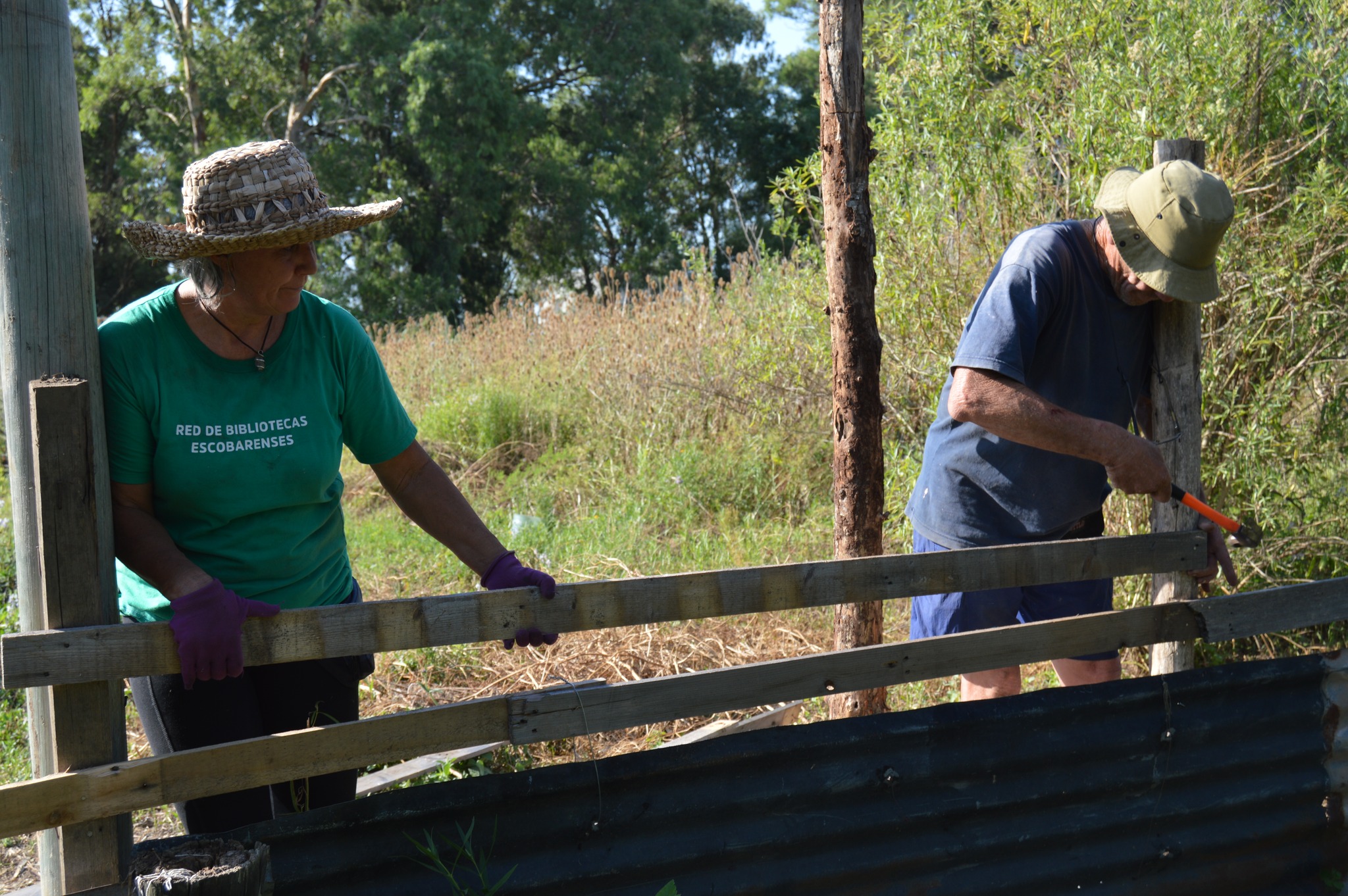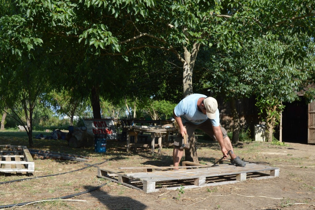 El domingo 11 de enero la jornada estuvo marcada por la urgencia de reforzar la seguridad de la huerta, tras detectar que los carpinchos podían ingresar a comer lo sembrado. Dedicamos gran parte de nuestras energías a desarmar palets, colocar nuevos postes y clavar maderas para elevar el cerco perimetral.