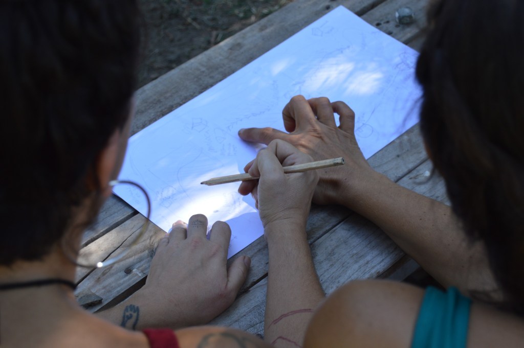 Para nutrirse de la información necesaria para poder diseñar y concretar este proyecto, las compañeras volvieron a hacer la visita guiada. «Recorrimos cada parte del territorio y pudimos bajarlo a un primer bosquejo eligiendo la pared y organizando este mapa mural», agregó Julieta.